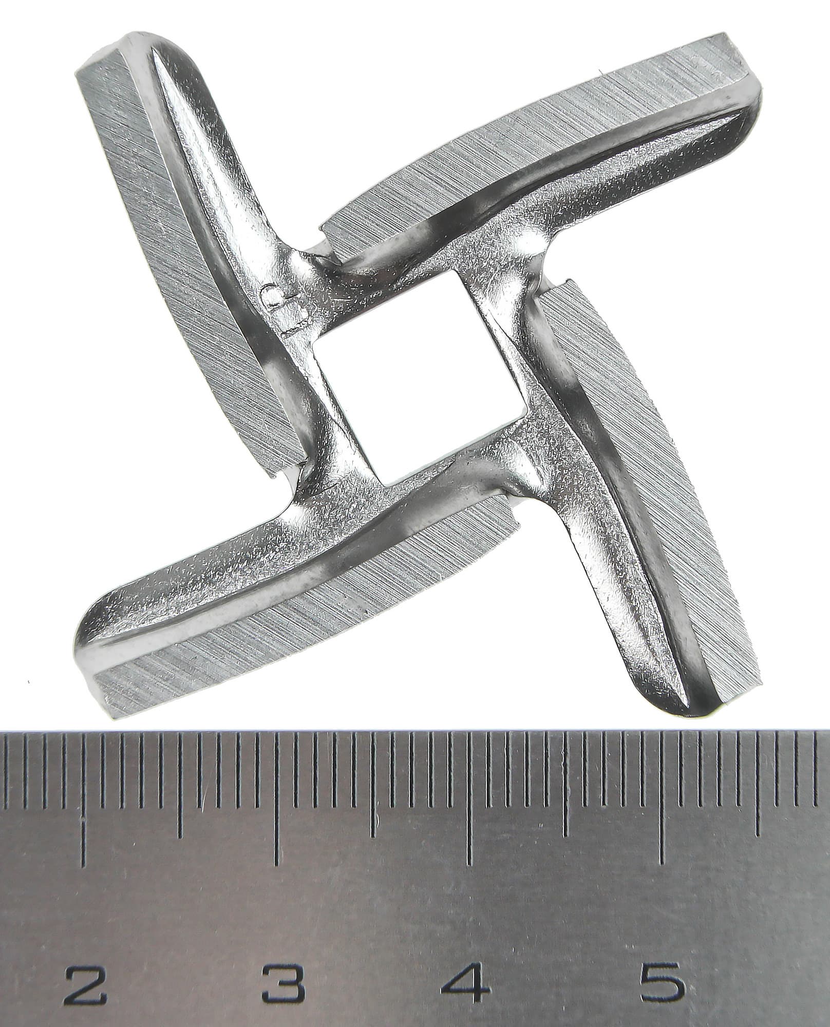 Блок мясорубки — металлический, в него вставляется шнек с уплотнительным кольцом, стальной нож, одна из двух решеток и все это фиксируется металлическим же кольцом с резьбой.