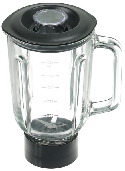 Чаша емкостью 1,5 л изготовлена из толстостенного стекла с мерной шкалой на боковой поверхности, удобной литой ручкой и носиком. Блок ножей состоит из шести ножей и пластикового стопорного кольца с силиконовой прокладкой. Крышка чаши — черная пластиковая с загрузочным отверстием. В отверстие вставляется прозрачный пластиковый мерный колпачок.