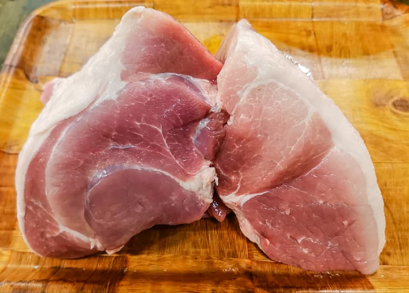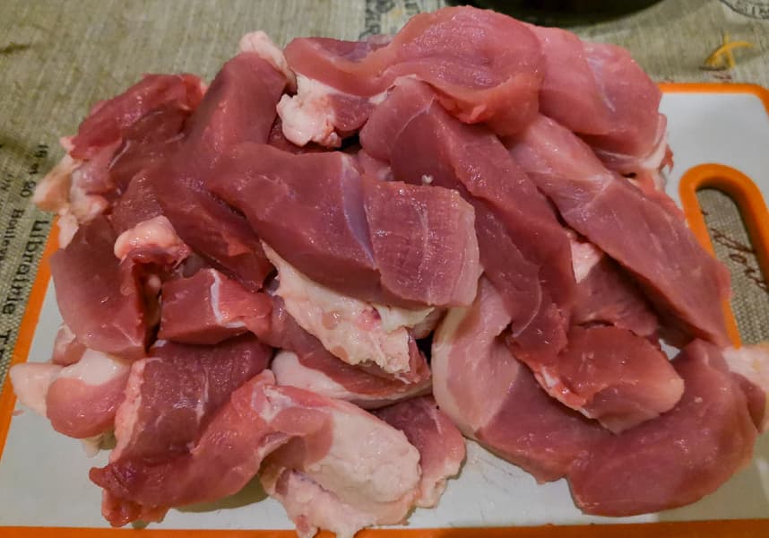 Нарезали мясо на произвольные крупные кусочки вместе с жиром.