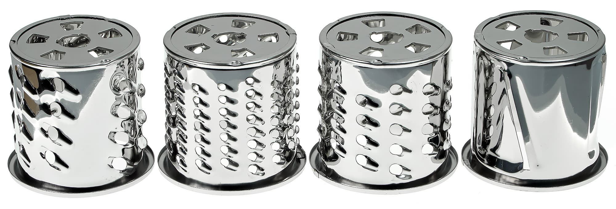 Овощерезка состоит из пластикового блока и барабанных терок, вставляемых в него. Терки закрепляются с помощью пластиковых выступов в блоке. В комплект входят три терки — крупная, средняя, мелкая, а также шинковки. Для блока овощерезки предусмотрен собственный толкатель из плотного пластика.