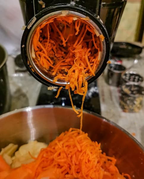 Морковь шинкуется достаточно легко. Иногда кусочки забиваются между шинковкой и блоком, это немного осложняет вынимание барабана шинковки.