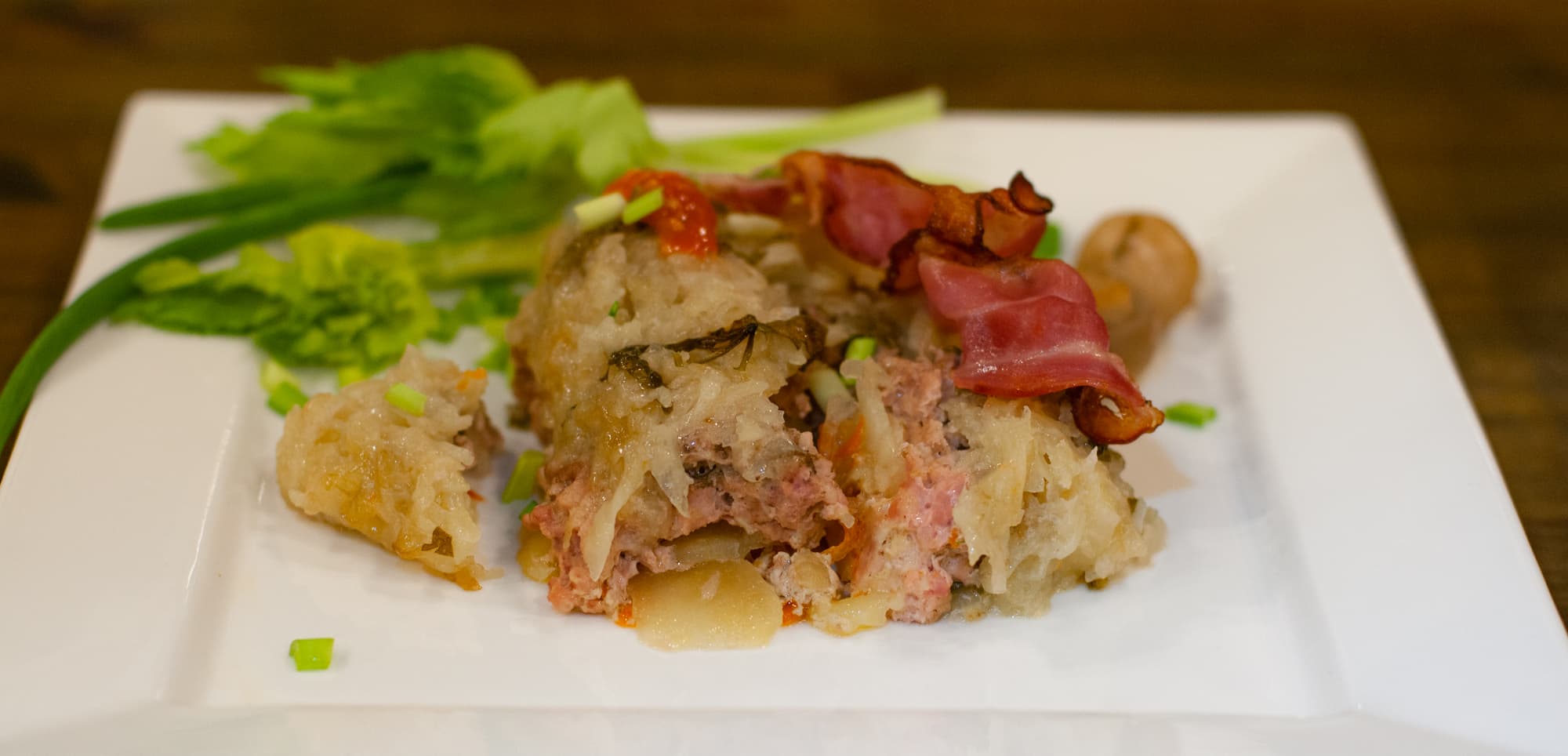 Фарш из индейки мы запекли с картофелем, который натерли с помощью блока овощерезки. Получилось не только вкусно, но и быстро.