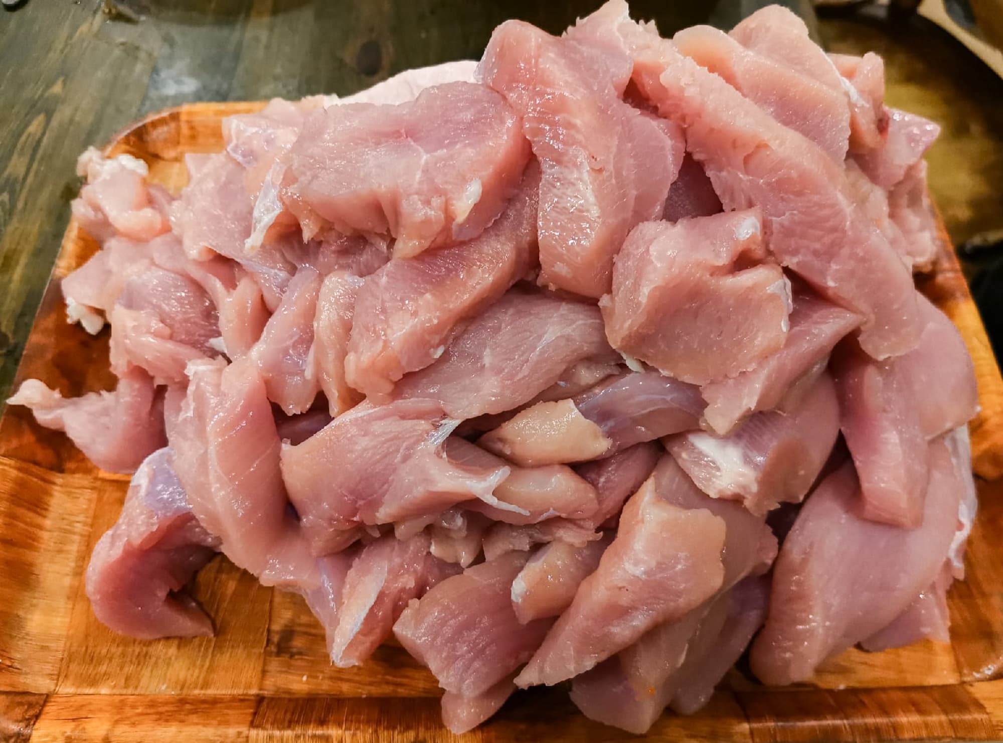 Мы взяли около 6 кг филе индейки, порезали произвольными кусками и прокрутили через мясорубку.