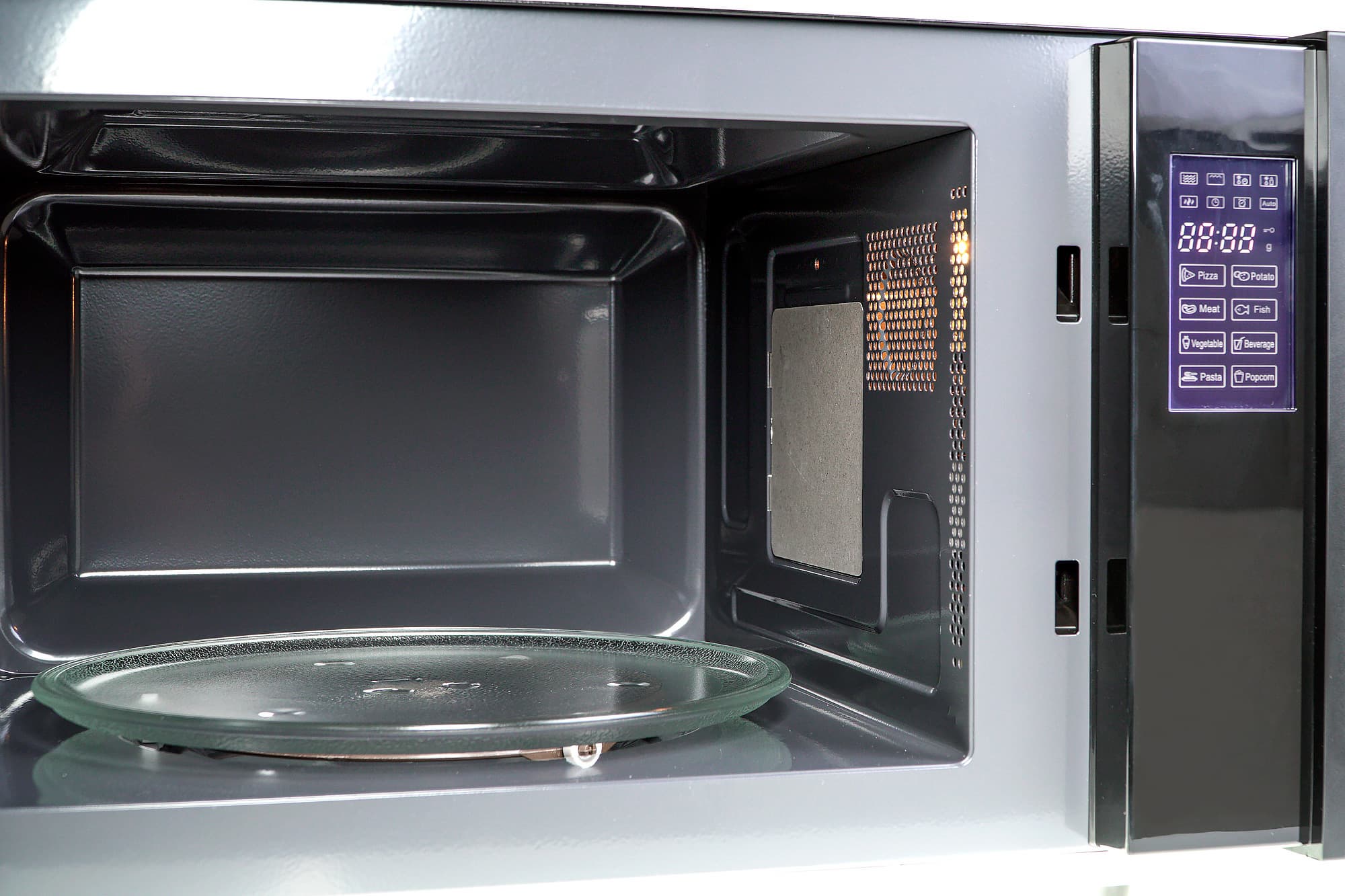 По заявлению производителя, внутренняя камера обработана полимерным покрытием. На ощупь и по виду оно напоминает классическое эмалевое. Форма рабочей камеры знакома всем, кто уже имел дело с СВЧ-печами. В центре дна имеется возвышение с поворотным механизмом. В углубление по его периметру устанавливается роликовое кольцо и стеклянная подставка.