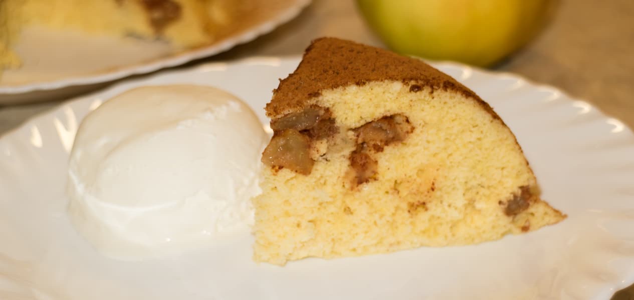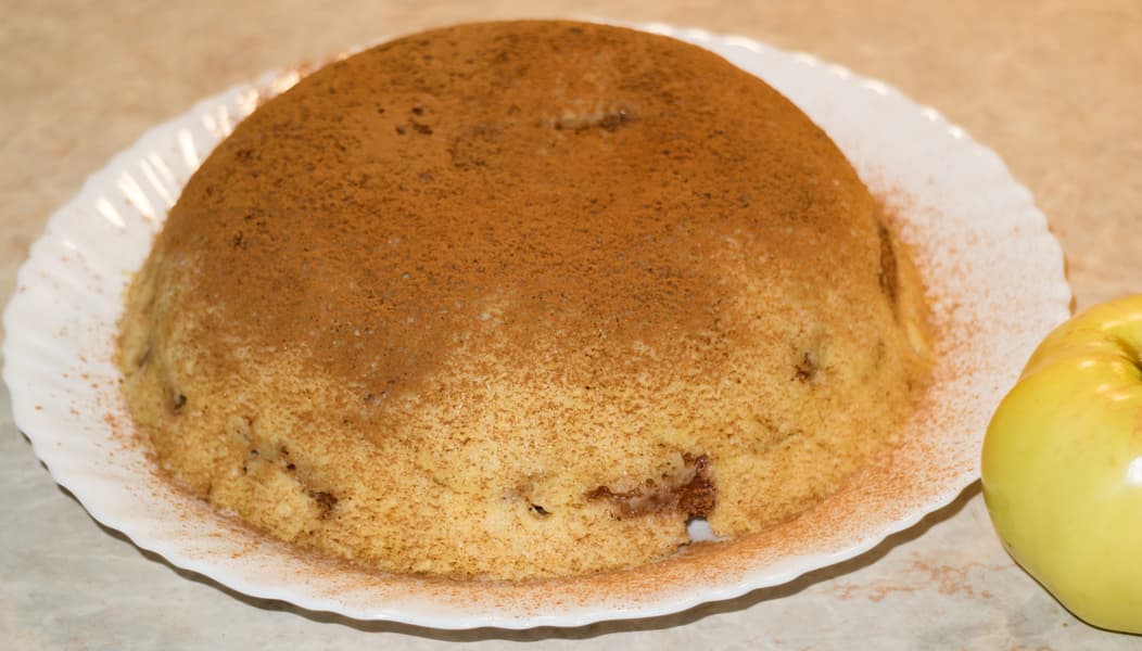 Яблоки — 250 г, яйца — 150 г (3 шт.), мука пшеничная в/с — 100 г, сахар — 100 г, масло сливочное — 20 г, разрыхлитель — 5 г, соль, корица, ванилин.