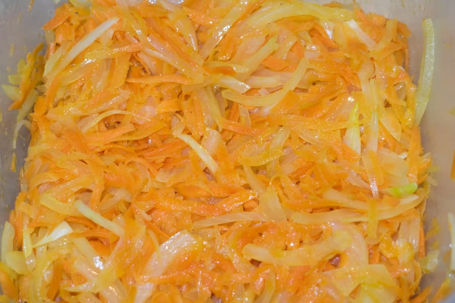 Затем достали, перемешали и продолжили приготовление в течение еще двух минут на максимальной мощности. Перемешали и отложили половину приготовленных овощей в отдельную миску.