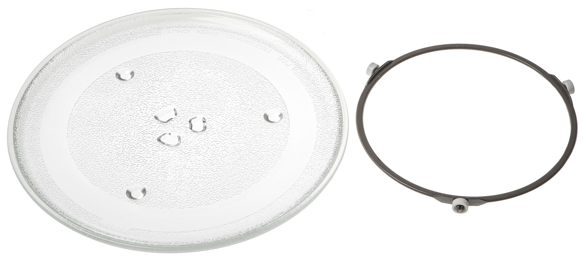 Роликовое кольцо и поднос имеют обычную форму и конструкцию. Диаметр стеклянного подноса — 27 см.
