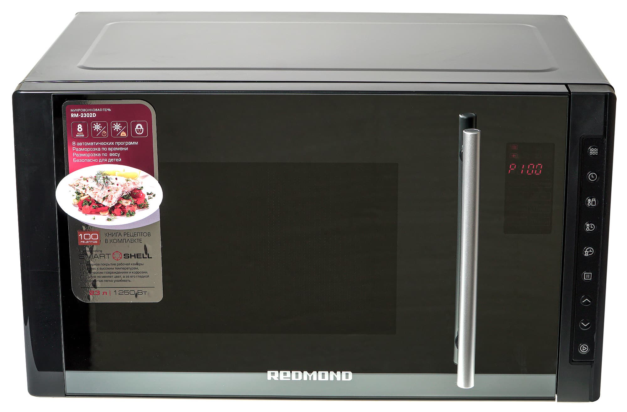 Микроволновая печь Redmond RM-2302D оснащена автоматическими программами приготовления. Всего прибор может самостоятельно подобрать параметры приготовления для восьми блюд. Причем в каждой категории пользователь имеет возможность выбора веса: