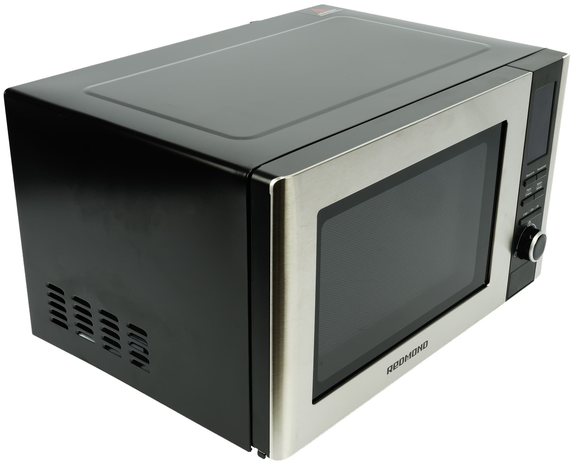 Микроволновая печь Redmond RM-2303D в основном чёрного цвета и только дверца, задняя и нижняя поверхности не имеют цветного покрытия — они металлические.