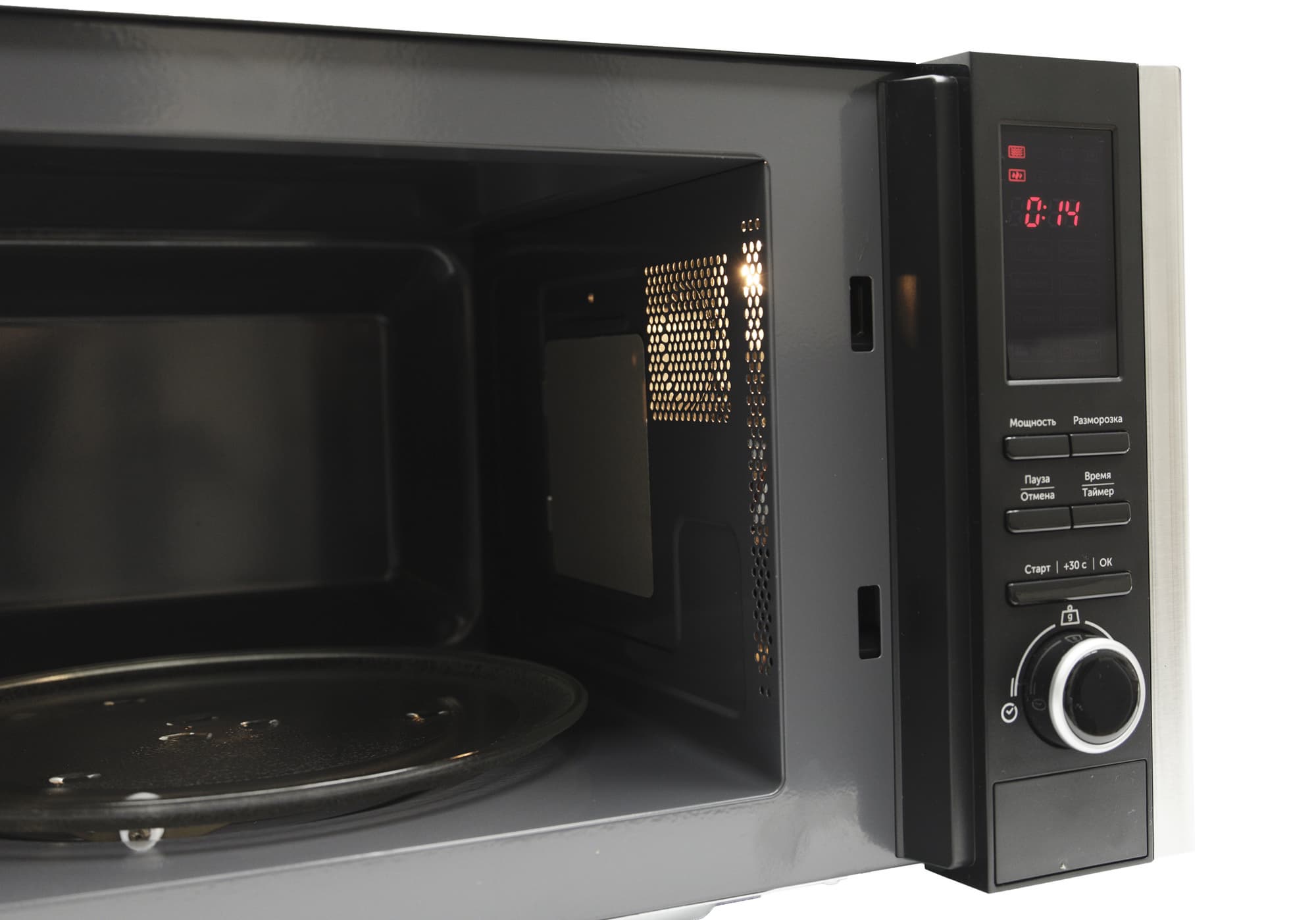 Никаких особых наворотов производитель нам не обещает — ни гриля, ни конвекции здесь не предусмотрено. Зато у устройства имеется русскоязычное наименование кнопок (пожалуй, это уже можно было бы отнести к плюсам, поскольку ни один символ не будет так понятен, как слово), 8 автопрограмм, износостойкое полимерное покрытие камеры, которое должно выдерживать интенсивный нагрев, не деформироваться и не менять со временем цвет, и функция поэтапного приготовления, позволяющая после разморозки сразу запустить подогрев.