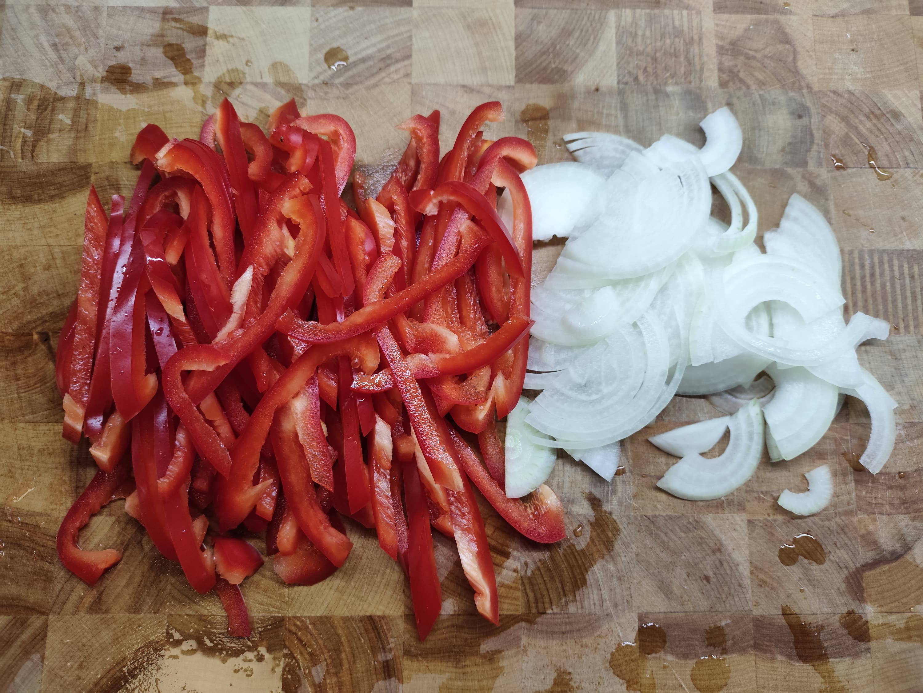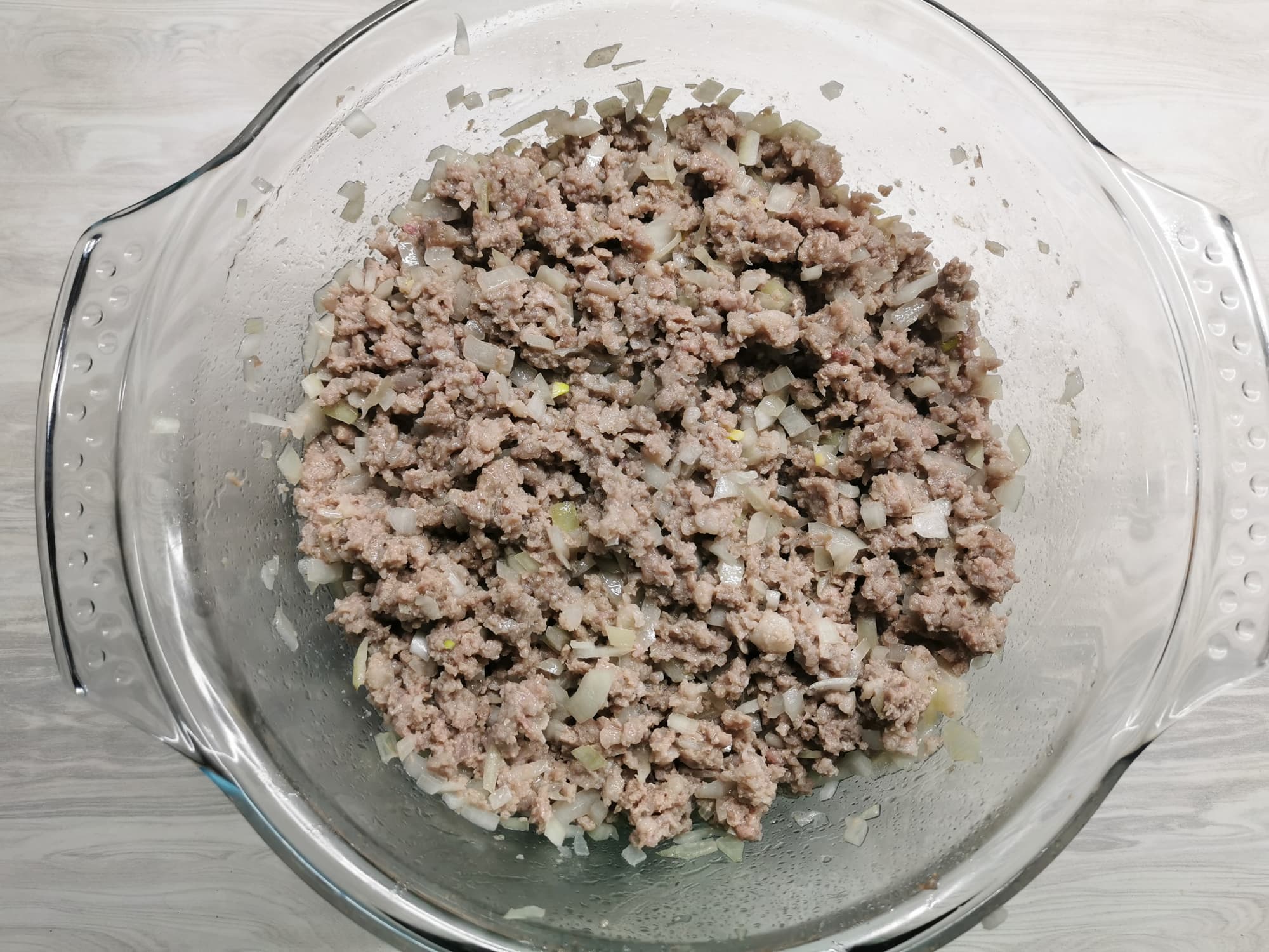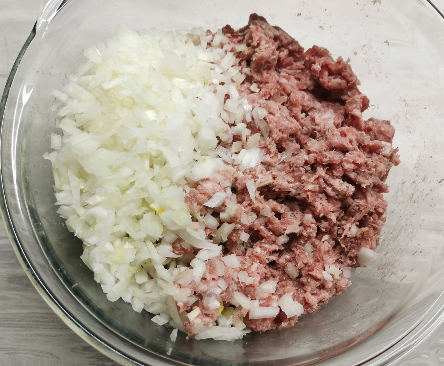Далее занялись фаршем: смешали его с мелко нарезанным репчатым луком, посолили и тоже слегка поперчили.