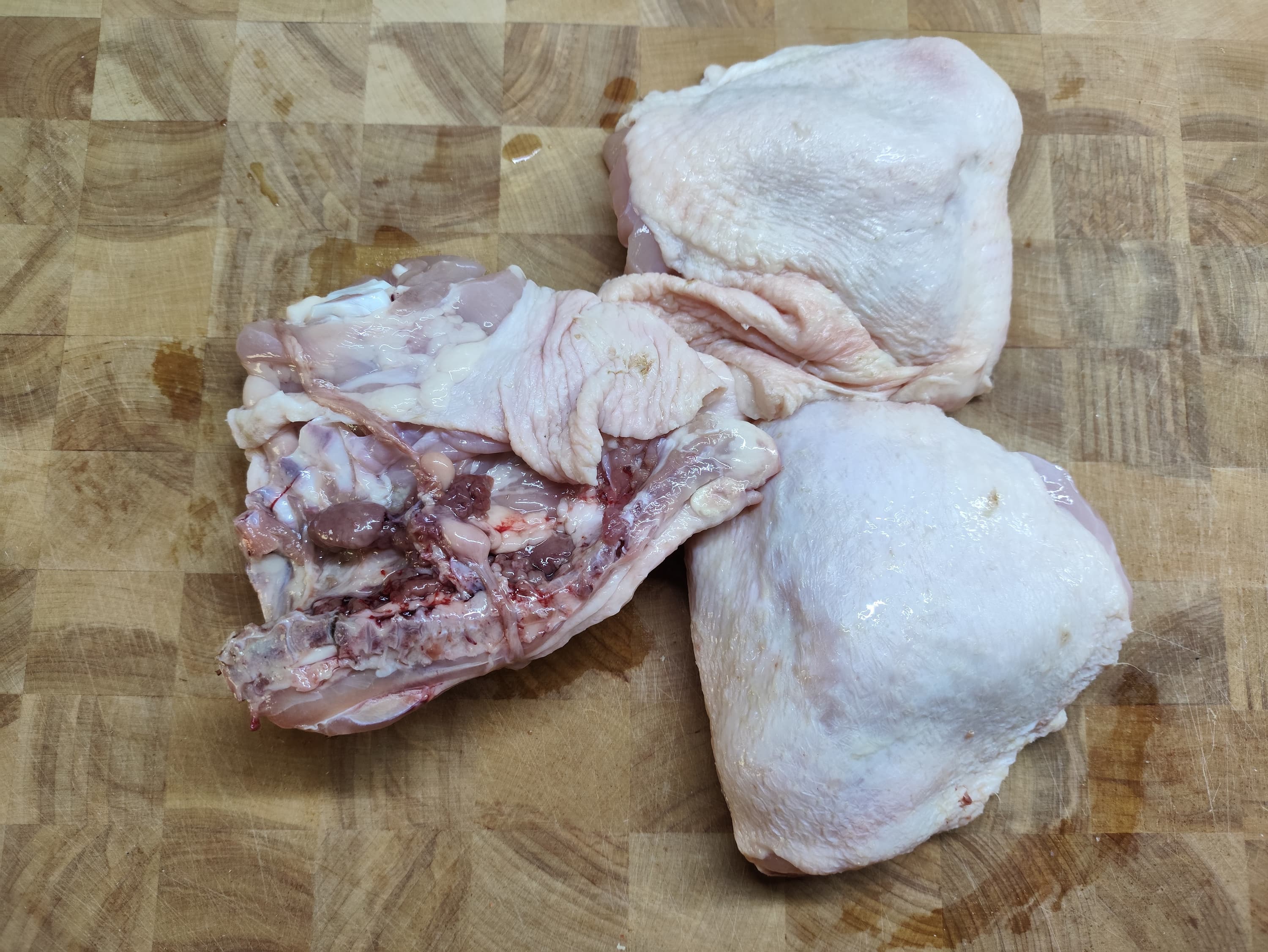 Отделяем мясо от костей, удаляем кожу. Куриная грудка нам тут не подойдет — она в микроволновке с довольно высокой вероятностью пересушится и станет жесткой, поэтому берем голень.