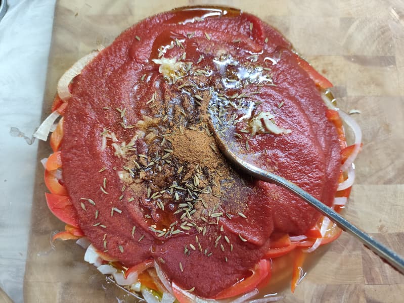Затем сливаем лишнюю воду, добавляем измельченные томаты и всевозможные специи. Тут у нас тертый чеснок, паприка, зира, кориандр, корица и кайенский перец. И немного оливкового масла.