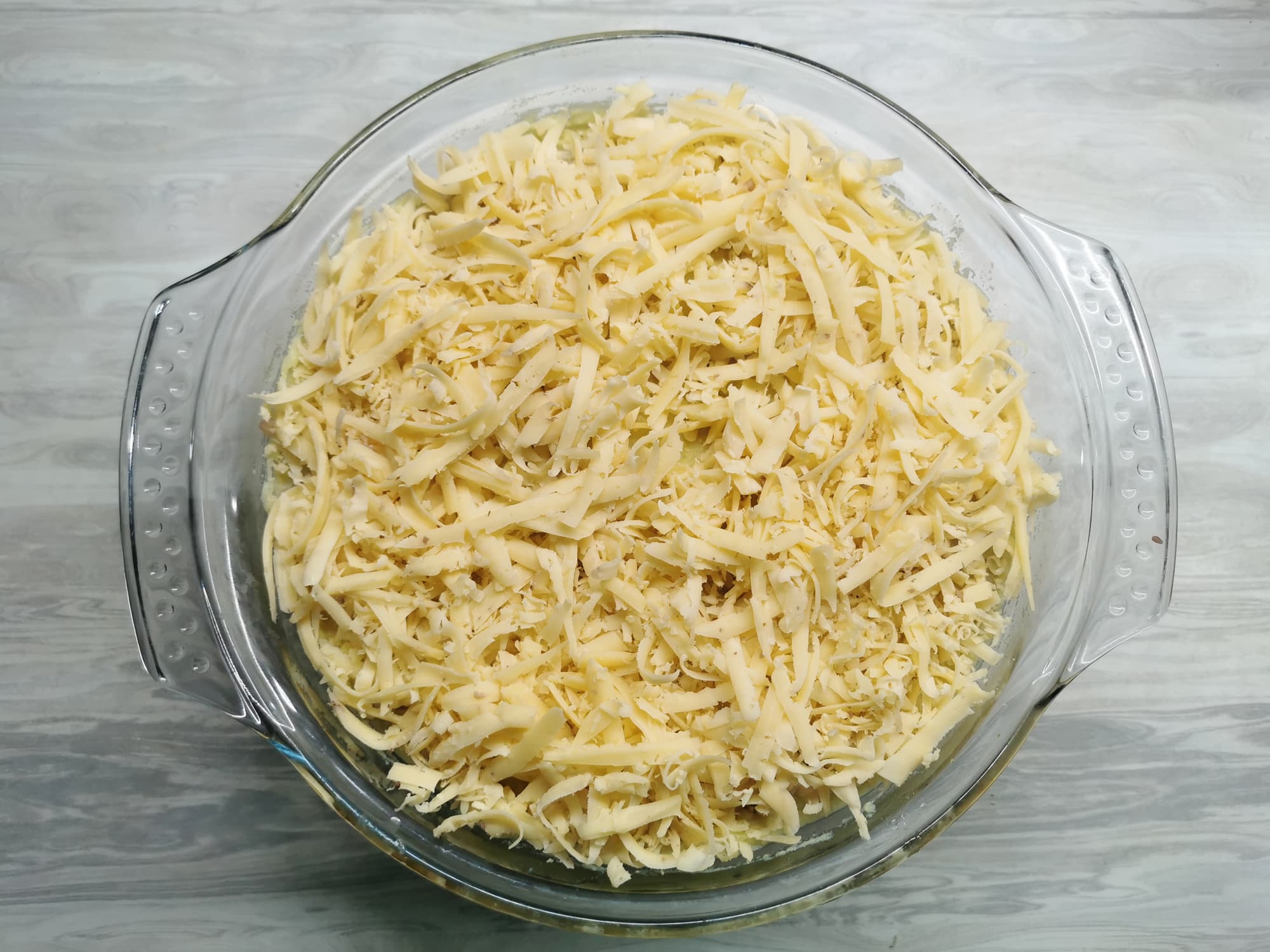 Для запеканки мы использовали приготовленное в предыдущем тесте картофельное пюре и домашний фарш, который также ранее разморозили для теста. Помимо этого нам понадобились: сыр, репчатый лук, 2 куриных яйца, соль и черный молотый перец.