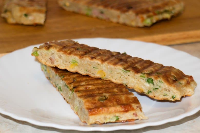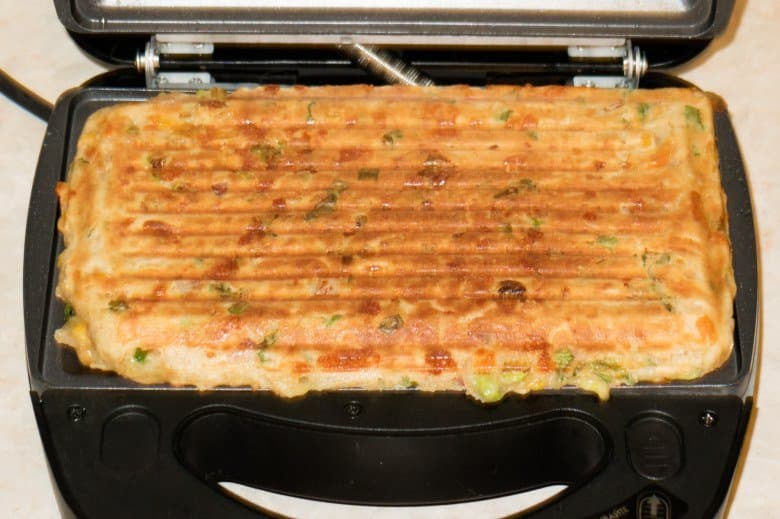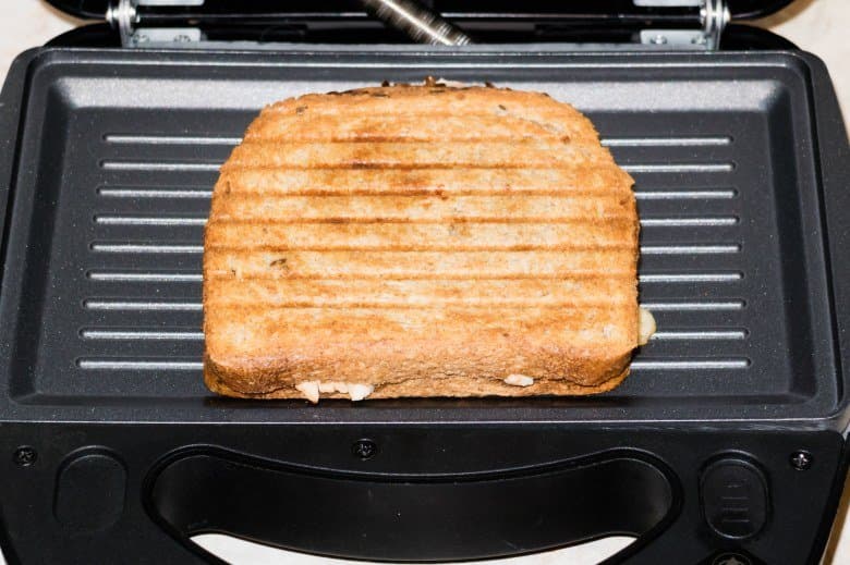 Поместили готовый бутерброд в прибор, аккуратно закрыли крышку и защелкнули замок в положении некоторого пространства между рабочими панелями. Жарили в мультипекаре около четырех минут.