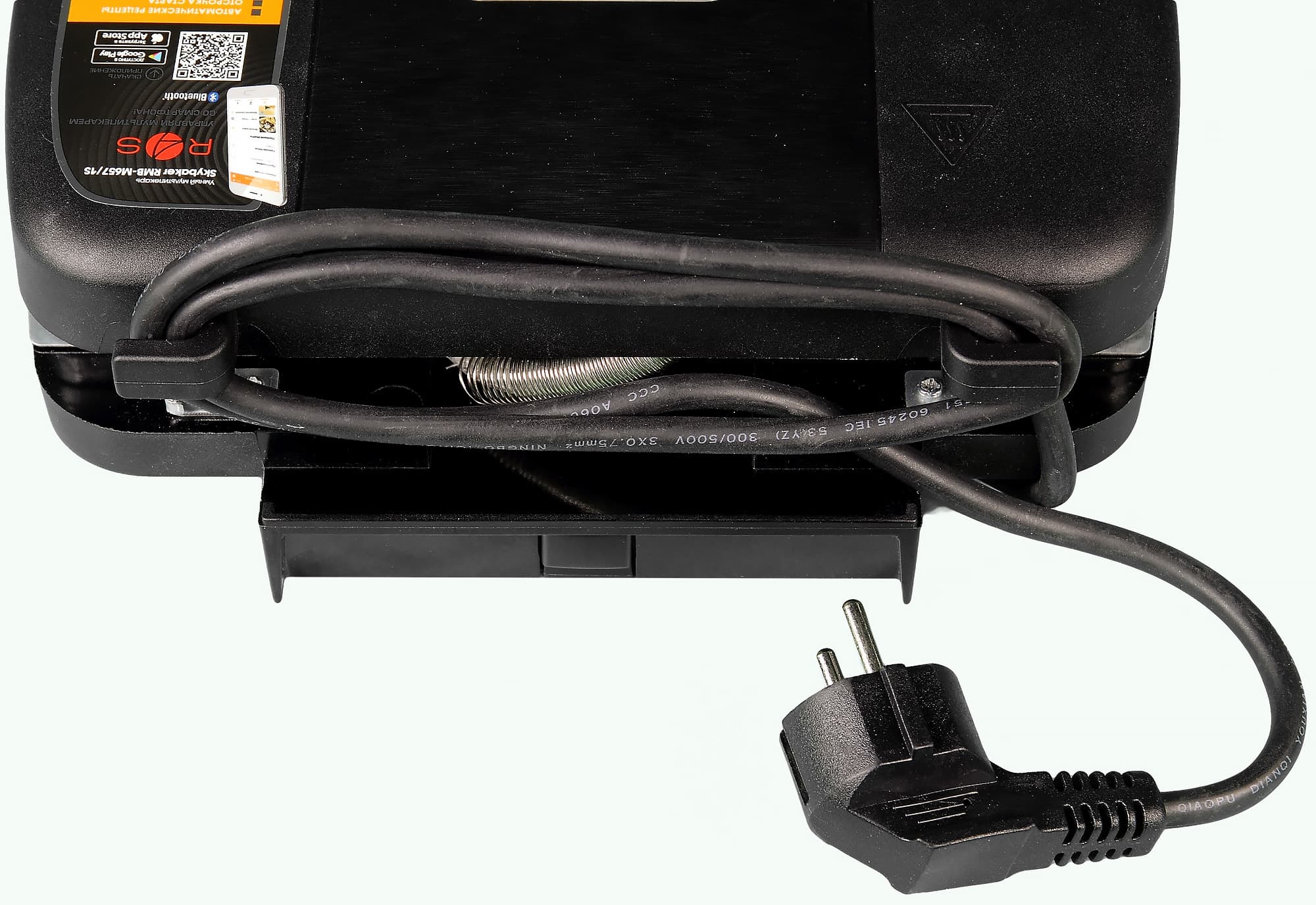 На задней стороне можно увидеть кабель питания и кнопку включения/выключения в нижней части. Два пластиковых ограничителя по сторонам предотвращают размещение устройства вплотную к мебели или стенам, а также служат дополнительной опорой при расположении прибора в вертикальном положении.