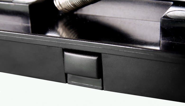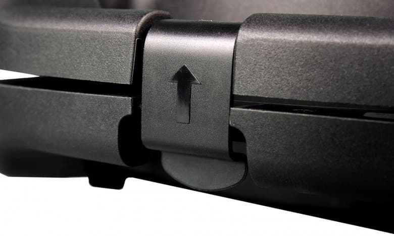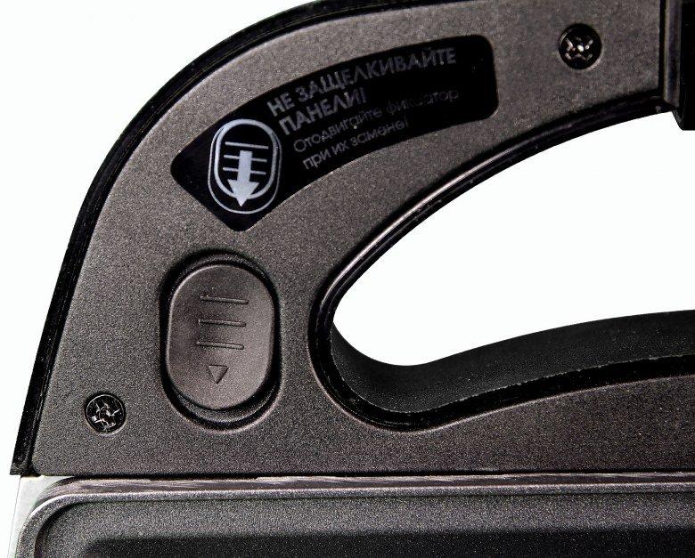 На пластиковых ручках находятся кнопки разблокировки съемных панелей. На кнопках-задвижках имеются подсказки, в какую сторону необходимо их сдвинуть, чтобы извлечь панели.