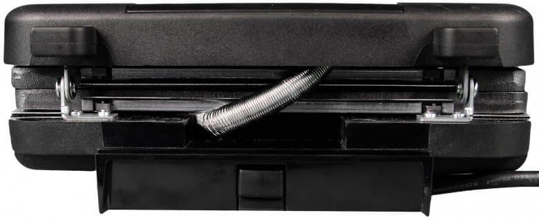 Внешне мультипекарь представляет собой небольшой легкий черный чемоданчик с цельными ручками. Прибор устойчиво и без скольжения располагается на столе. Отметим, что устройство может находиться в вертикальном положении, т. е. с опорой на заднюю часть. Эта возможность крайне ценна при хранении.