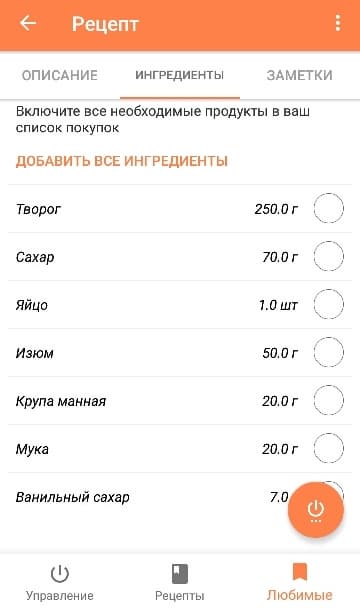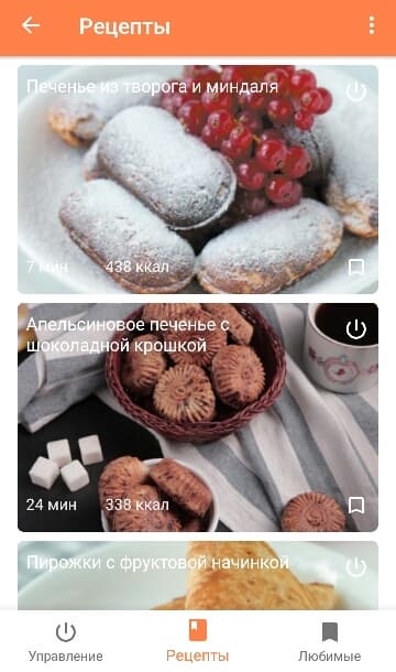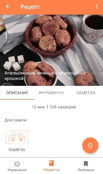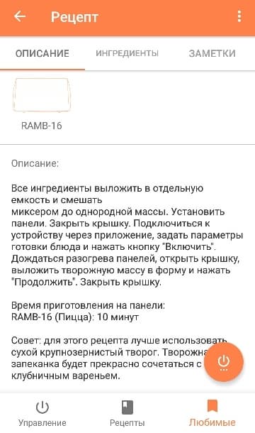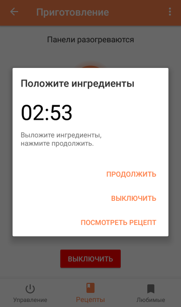 Раздел «Рецепты» предполагает не только ознакомление со списком ингредиентов и ходом приготовления. В каждом рецепте имеется подсказка, какой именно панелью нужно воспользоваться для реализации желаемого результата. Удобно то, что запустить процесс выпечки можно прямо из рецепта. При нажатии на кнопку включения, пользователь переходит в окно установки параметров. По завершении нагрева панелей выводится предупреждение о том, что пришла пора выложить продукты или тесто. И только после этого запускается таймер обратного отсчета непосредственно жарки или выпечки.