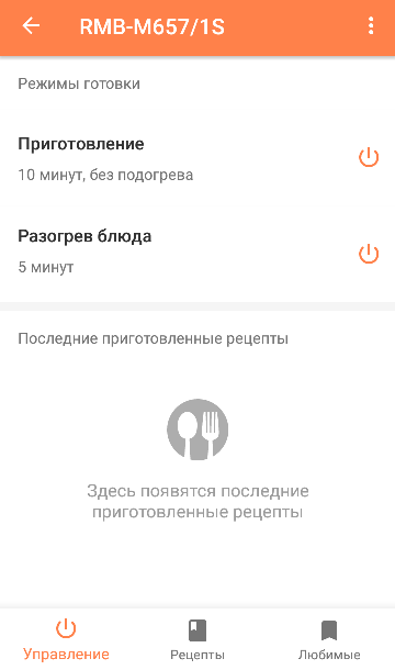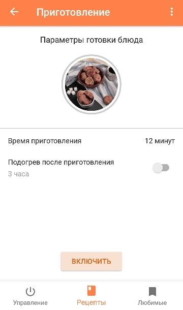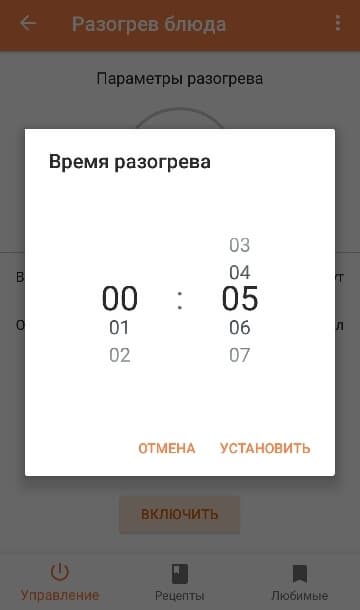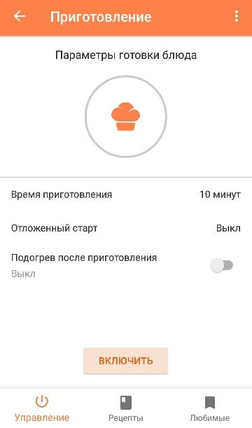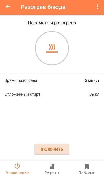 В главном меню прибора пользователь имеет возможность управлять устройством или перейти в раздел рецептов. В первом случае можно выбрать функции — приготовление или разогрев блюда. При нажатии на соответствующий пункт, открывается окно параметров, в котором можно установить время процесса, отсрочку старта и включить функцию подогрева.