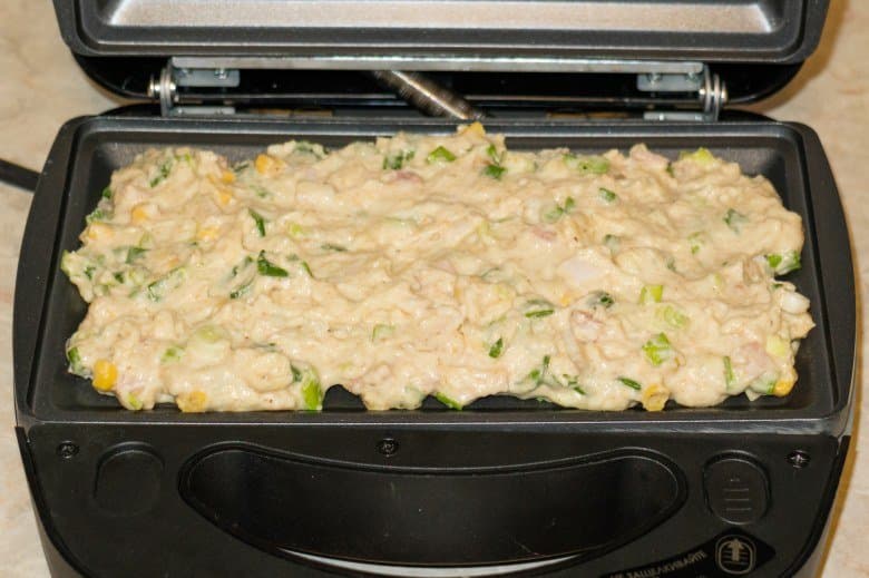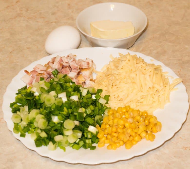 Пшеничная мука — 1 стакан, кукурузная мука — 1 стакан, сахар — 1 ст. л., соль — ½ ч. л.. разрыхлитель — ½ ч. л., молоко — 300 мл, яйцо — 1 шт., ветчина (бекон, балык) — 110 г, зеленый лук — 110 г, сыр (чеддер, голландский) — 90 г, кукуруза консервированная — 60 г, масло сливочное — 40 г.