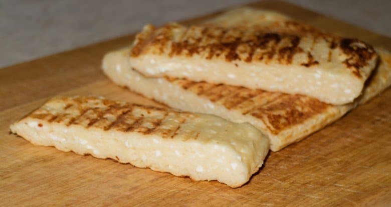 Жарили 15 минут. Примерно посередине процесса перевернули лепешку, чтобы поджарить верхнюю сторону. Сразу после выпечки и остывания нарезали на полоски. Масса мягкая; если немного подсушить на воздухе, то становится жестче, но сохраняет некоторую гибкость структуры. В итоге получили нечто забавное: то ли печенье, то ли энергетические батончики.