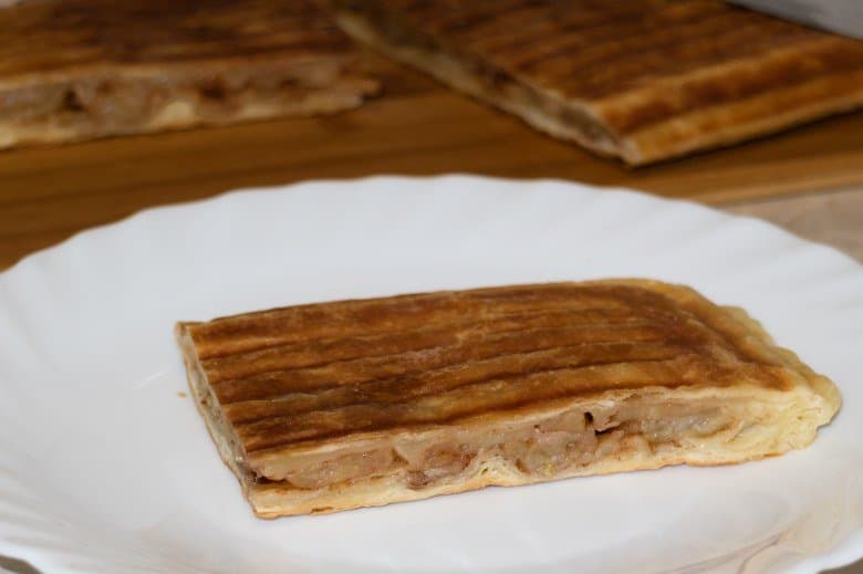 Очистили и нарезали на небольшие ломтики два яблока, добавили столовую ложку сахара, половину чайной ложки корицы. Хорошо перемешали и отставили в сторону на некоторое время. Затем слегка раскатали слоеное тесто (500 г) с таким расчетом, чтобы его хватило на два пирога. Пироги, разумеется, предполагалось печь в Redmond RMB-M657/1S, т. е. при раскатке теста исходили из размера панелей.