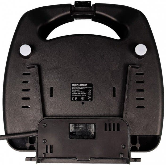 Со стороны дна мультипекарь оснащен небольшим основанием и двумя ножками с прорезиненными накладками, предотвращающими скольжение по поверхности стола. Здесь же расположены вентиляционные отверстия для отвода нагретого воздуха и две щели для стока жидкости.