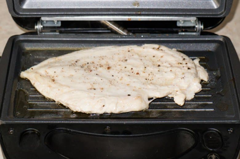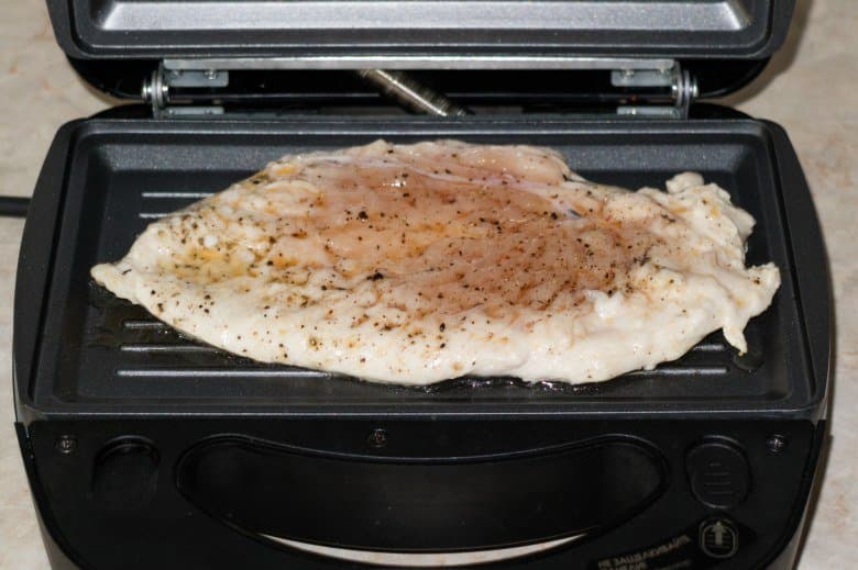 Нагрели мультипекарь и выложили в него один кусок грудки. Плотно сомкнули панели. Через четыре минуты открыли крышку и обнаружили, что верхняя панель не касается куска вовсе.