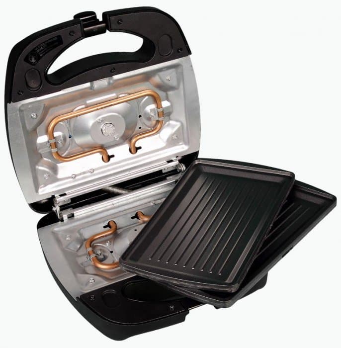 Нагревательные элементы мультипекаря находятся под жарочными панелями. Внутренняя часть прибора изготовлена из неокрашенного металла.