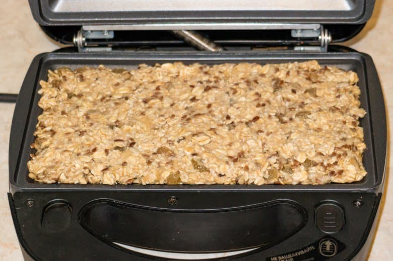 Пюрировали бананы, добавили хлопья, изюм, семечки, немного кунжута и семян льна. Перемешали до однородной массы и оставили на 10 минут. Затем разогрели мультипекарь, выложили половину этой массы на панель и хорошо разровняли. Защелкнули фиксатор крышки в положении плотного прилегания панелей.
