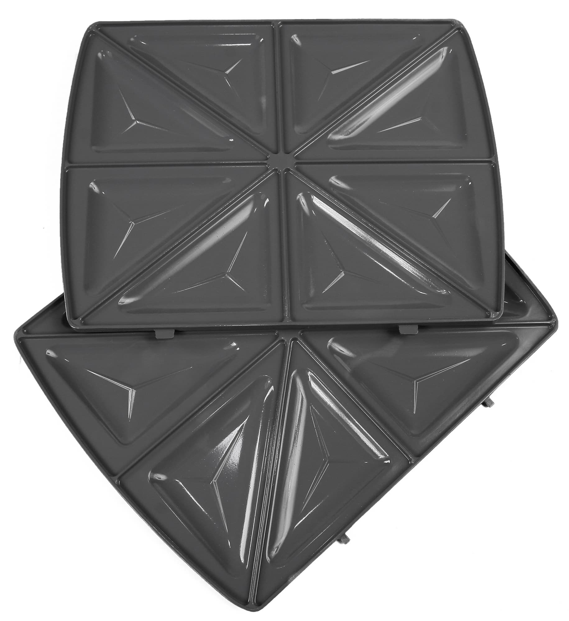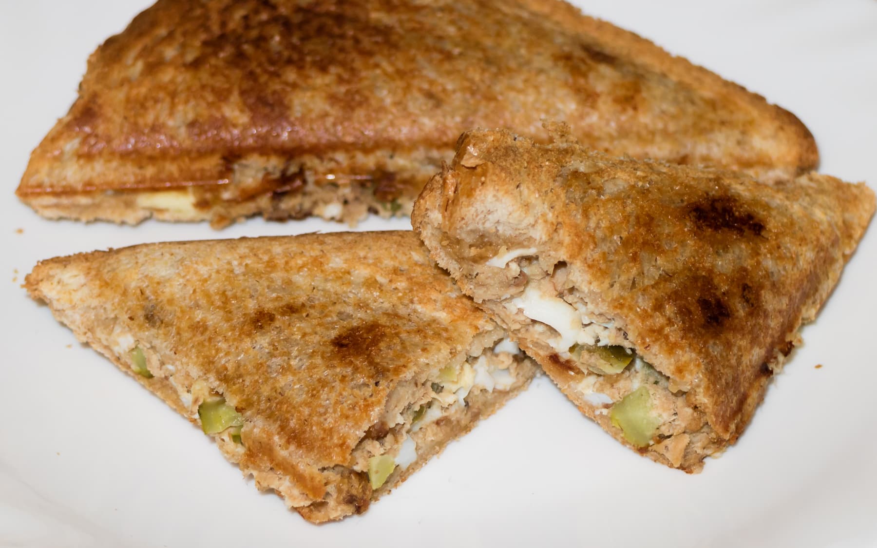 Положили начинку на один ломтик хлеба, сверху прижали другим. Тепловая обработка составила около пяти минут. Панели установили с зазором между ними, что без усилий позволяет сделать защелка на ручках мультипекаря.