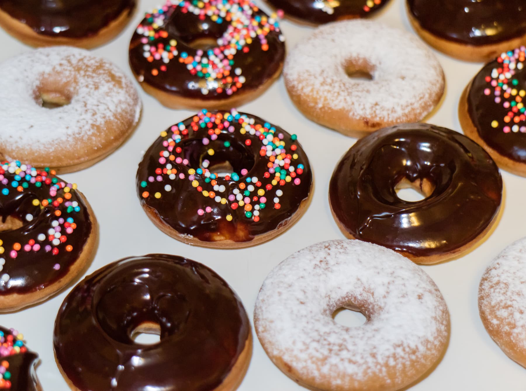 Готовые пончики после охлаждения полили шоколадной глазурью и украсили декором. Некоторые изделия просто посыпали сахарной пудрой.