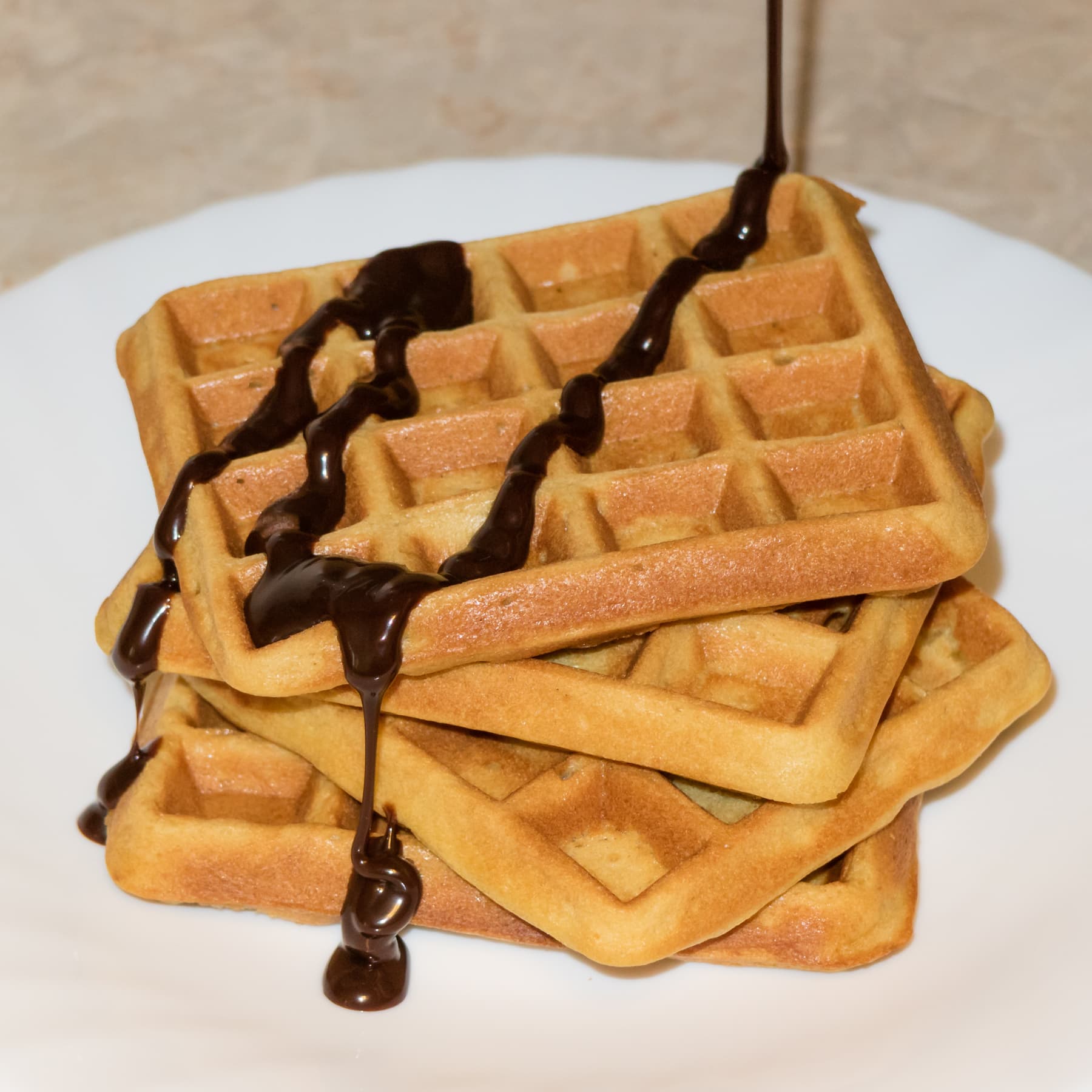 Готовности вафли достигли примерно через 7-8 минут. В книге рекомендуемое время выпечки составляет 10-12 минут. Нижняя и верхняя поверхности вафель прожарены равномерно. При подаче полили теплые вафли шоколадным сиропом.