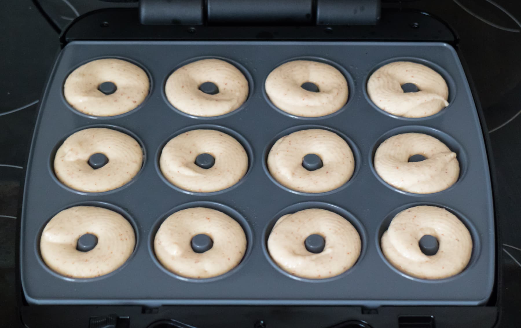 Растопили сливочное масло, добавили в него кефир и сахар. Хорошо перемешали. Добавили в заготовку яйца, экстракт ванили и соду. Еще раз хорошо вымешали. Постепенно добавляя муку, хорошо взбили тесто. Дали ему постоять 20 минут для набухания клейковины. Однако тесто было излишне жидким — густота подобна тесту для блинов. Рецепт рекомендует переложить готовое тесто в кондитерский мешок, но это невозможно, потому что тесто вытекает еще в процессе переливания его в мешок. Несмотря на это и возникшие подозрения по поводу рецептуры, мы испекли одну порцию пончиков из получившейся массы. Для последующей выпечки добавили еще муки так, чтобы тесто достигло консистенции жидкой сметаны. Отсаживали наши будущие пончики в углубления разогретых панелей с помощью кондитерского мешка.