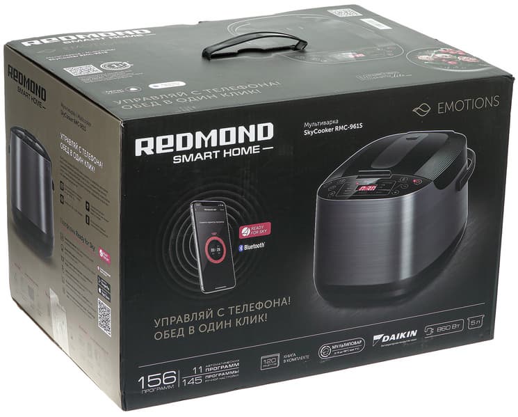 Упаковка Redmond SkyCooker RMC-961S отошла от традиционных изображений девушек: на черном фоне крупно изображена черно-серая мультиварка, рядом черный условный смартфон с запущенным приложением Ready for Sky. Логотип и ключевые особенности выполнены в белом цвете, а слоган и название линейки Emotions написаны бронзовым. Откровенно говоря, такой сдержанный стиль вызывает столь же спокойные эмоции — с другой стороны, для подарка такая лаконичность играет в плюс.