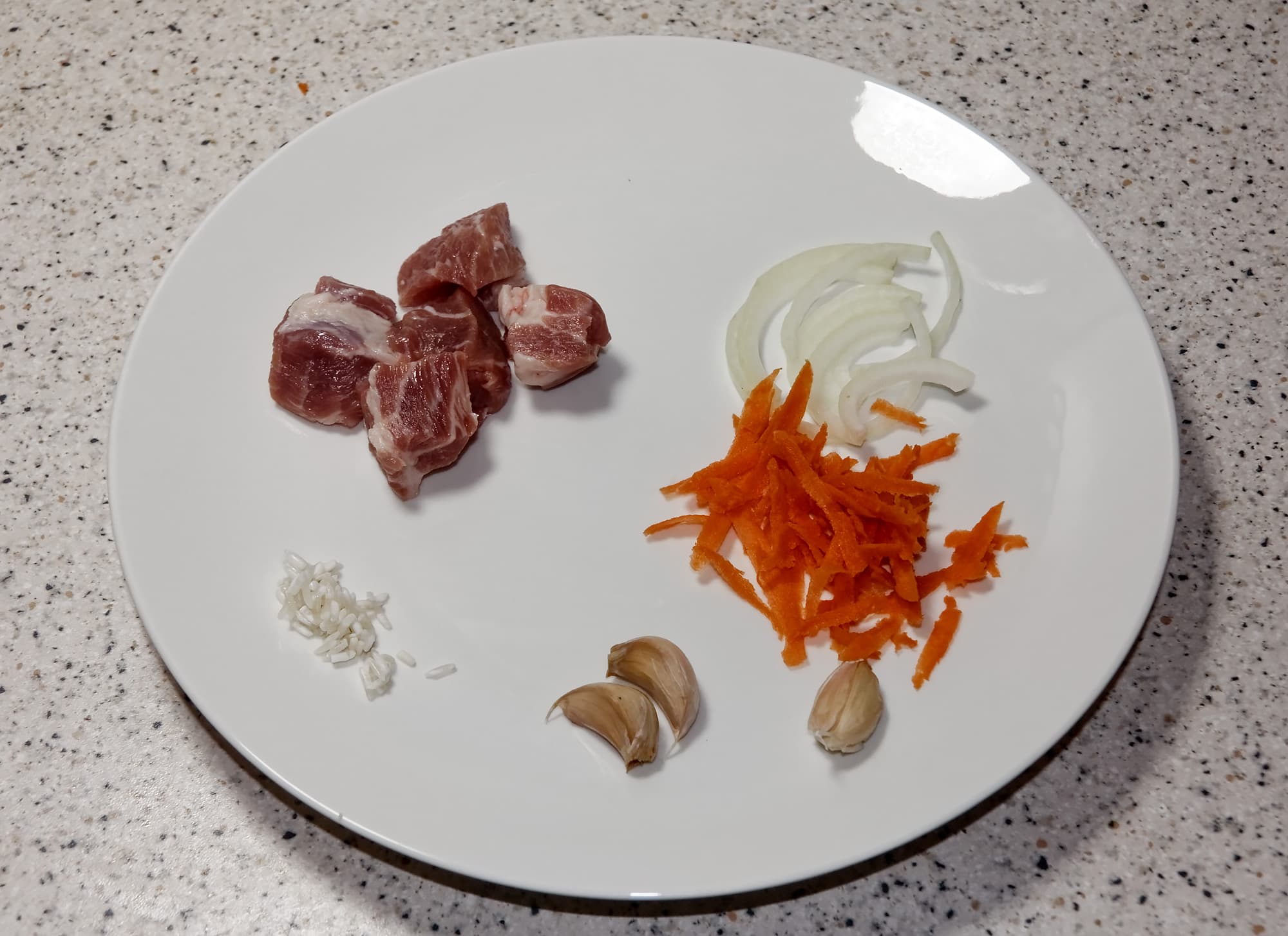 Порядок приготовления плова оказался следующим — промываем рис до прозрачной воды, мясо нарезаем кубиками по 2-2,5 см. Морковь натираем на крупной терке, лук нарезаем средней соломкой. Зубчики чеснока промываем, но не очищаем.