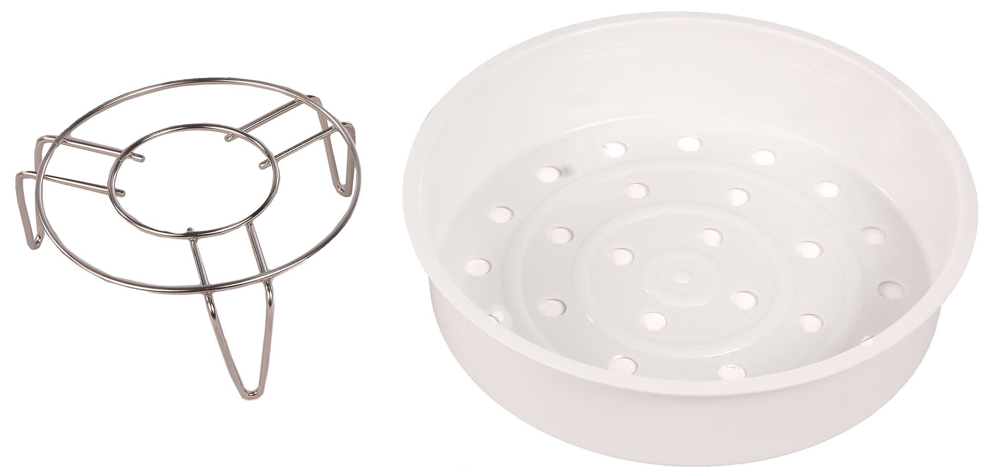 Как мы видим, комплектация стандартна для полноценных мультиварок. Внимание привлекает решетка для приготовления на пару́, которую встретишь далеко не у каждой модели. Такая решетка позволяет использовать для приготовления на пару́ любую посуду подходящего диаметра, а не только прилагаемый пластиковый контейнер.