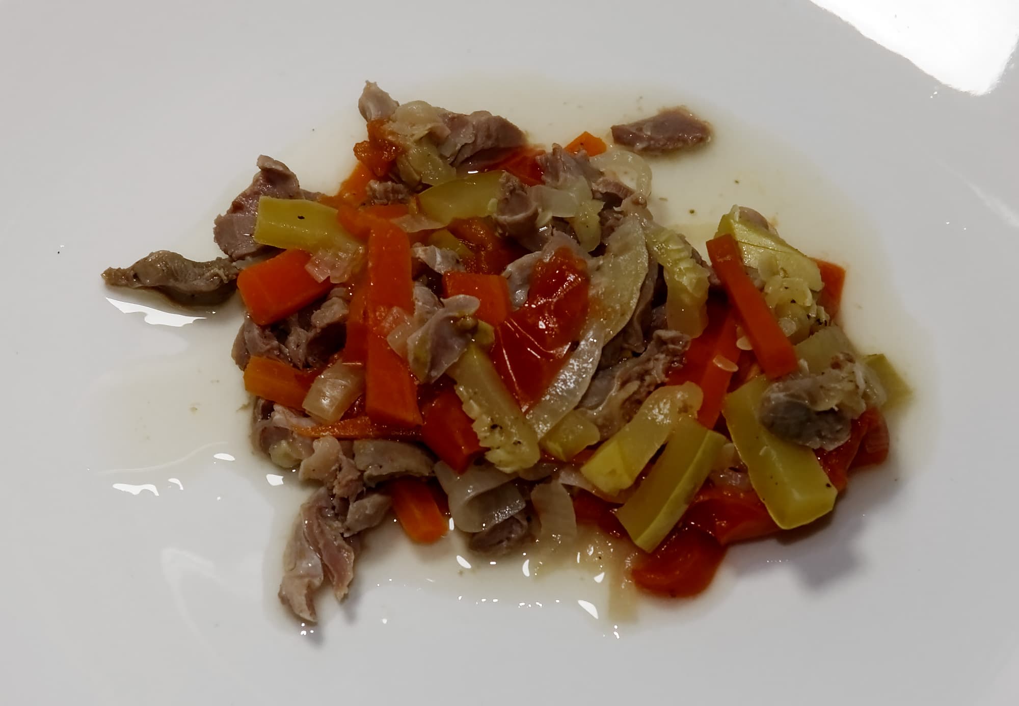 Открыв крышку мультиварки через 1 час мы получили готовое блюдо, состоящее из тушеных желудков и тушеных же овощей. Просто и сытно, хоть и не очень оригинально.