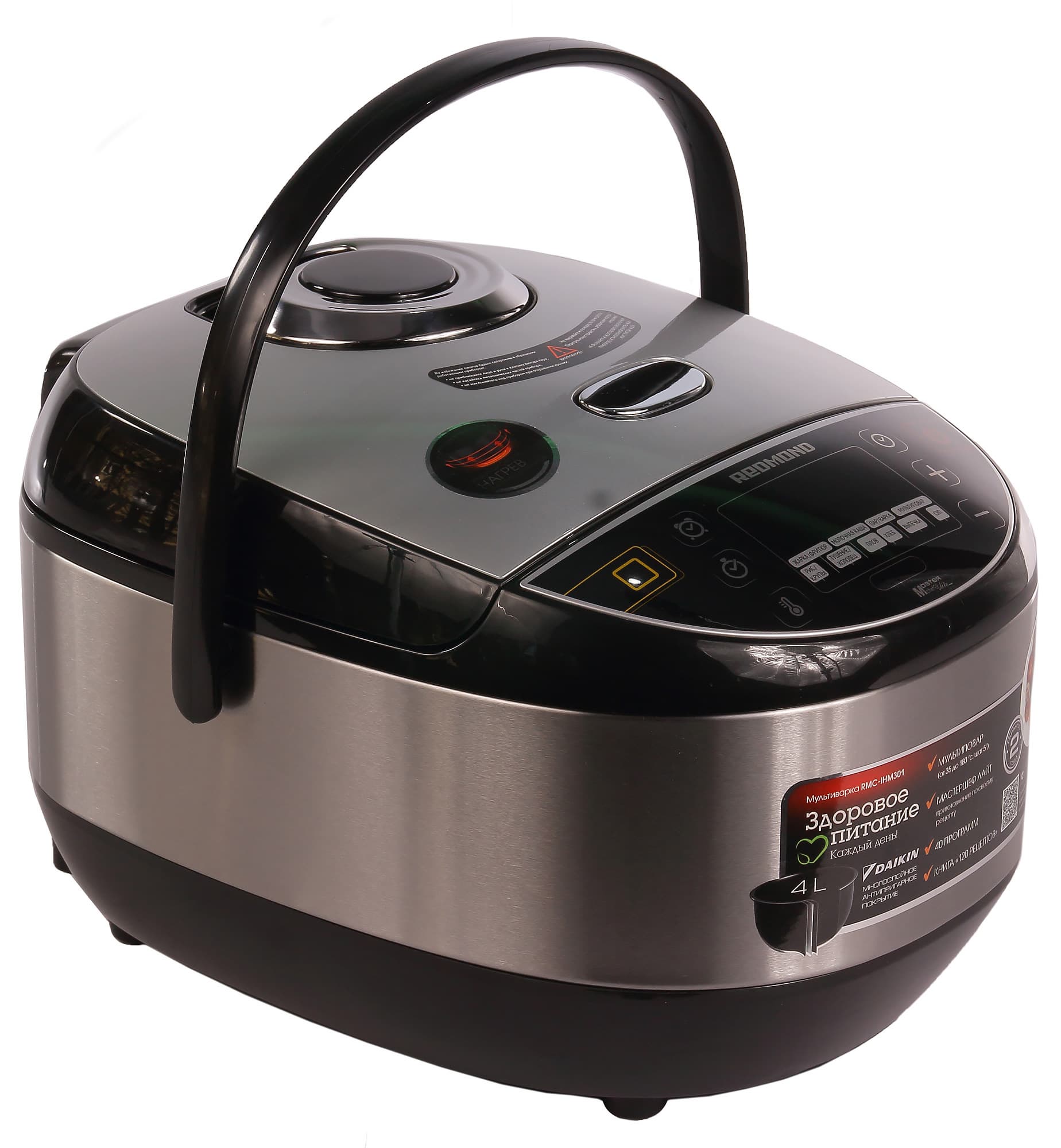За управление отвечает простая, но симпатичная панель с сенсорными кнопками и красными светодиодными индикаторами. Для переноски мультиварки можно использовать откидную ручку — достаточно крепкую для того, чтобы без проблем переносить мультиварку со всем ее содержимым.