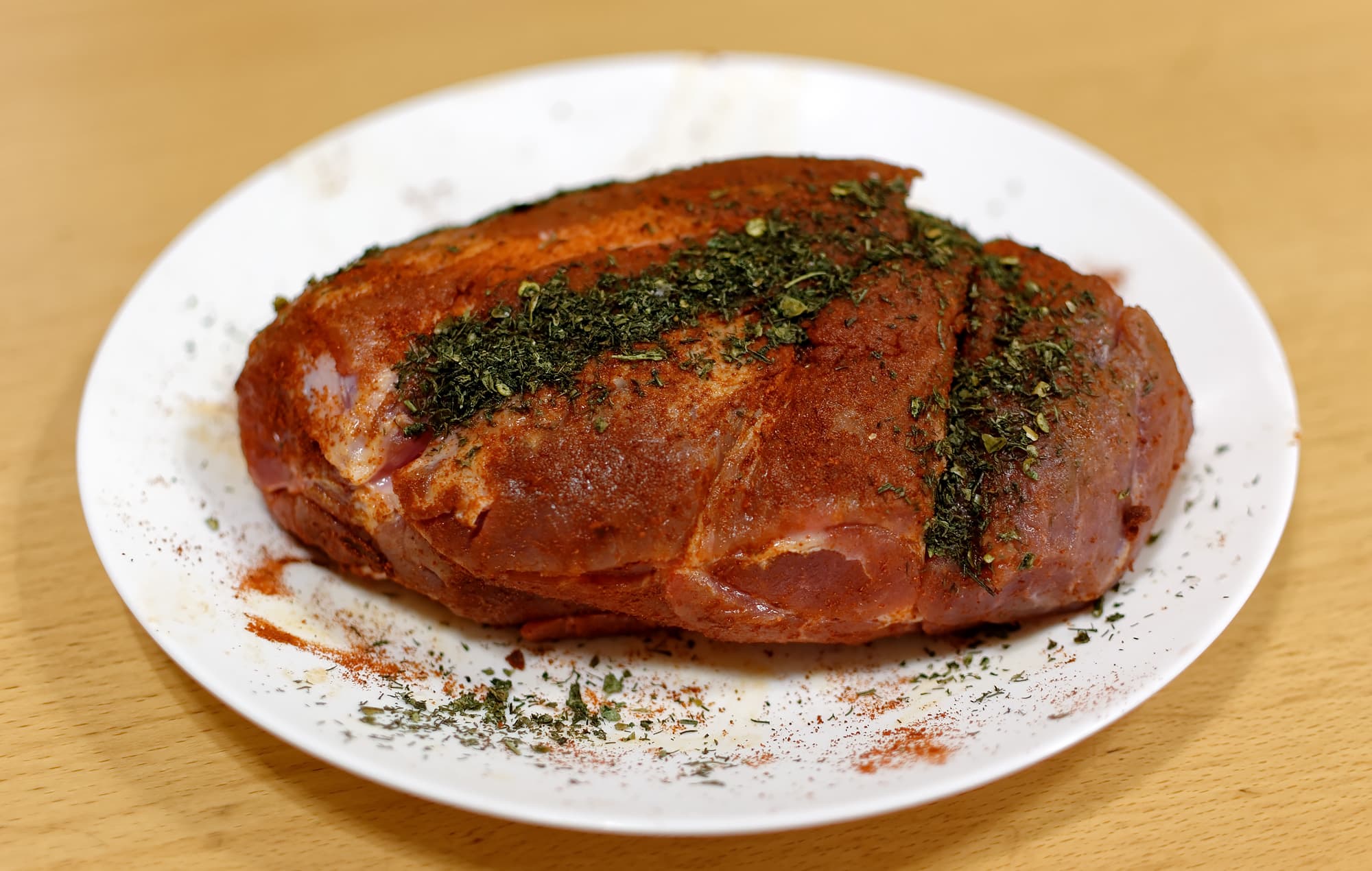 Мы натерли свинину солью и паприкой, добавили «зеленой приправы» из сушеных трав и зеленого чили. Вакуумировали кусок.