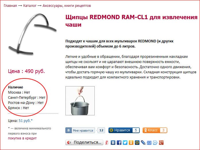Отдельного упоминания заслуживают предметы, которых нет в комплекте, их предлагают приобрести дополнительно. Среди таких аксессуаров, кроме разнообразных ветчинниц, банок для йогурта и сеток-фритюрниц — щипцы для извлечения чаши. Без них доставать горячую чашу из мультиварки неудобно. Можно не доставать, пока не остынет, но остывает внутри устройства она довольно долго. В общем, вроде и так неплохо живем, но можно бы и получше. Щипцы в официальном интернет-магазине Redmond стоят совсем не копейки, да и их наличие на момент написания статьи было, мягко говоря, неидеальным.