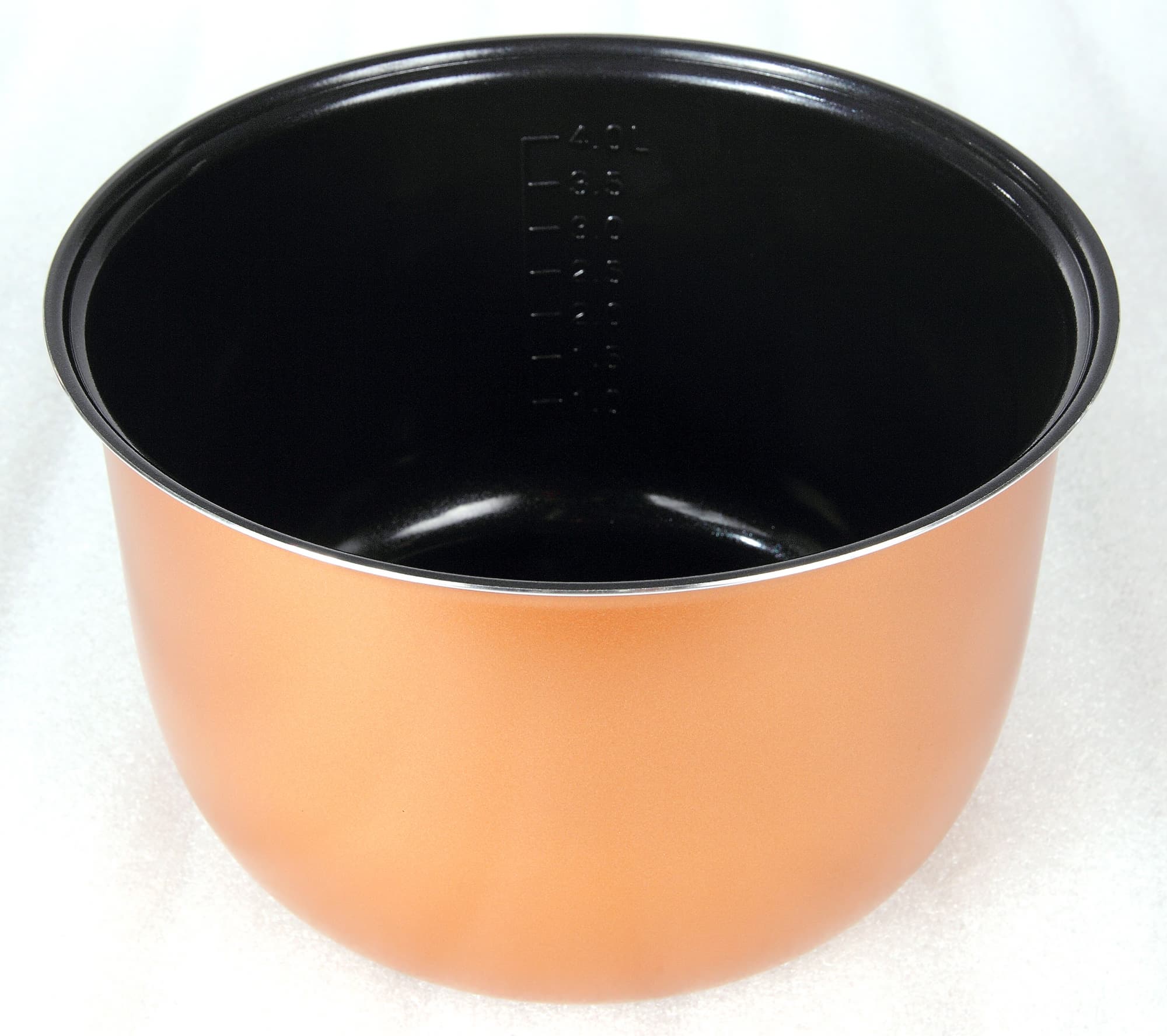 Чаша с керамическим покрытием и довольно тонкими стенками имеет градуировку от 1 до 4 литров с шагом в 0,5 литра. Таким образом, максимальный полезный объем «пятилитровой» чаши составляет четыре литра.