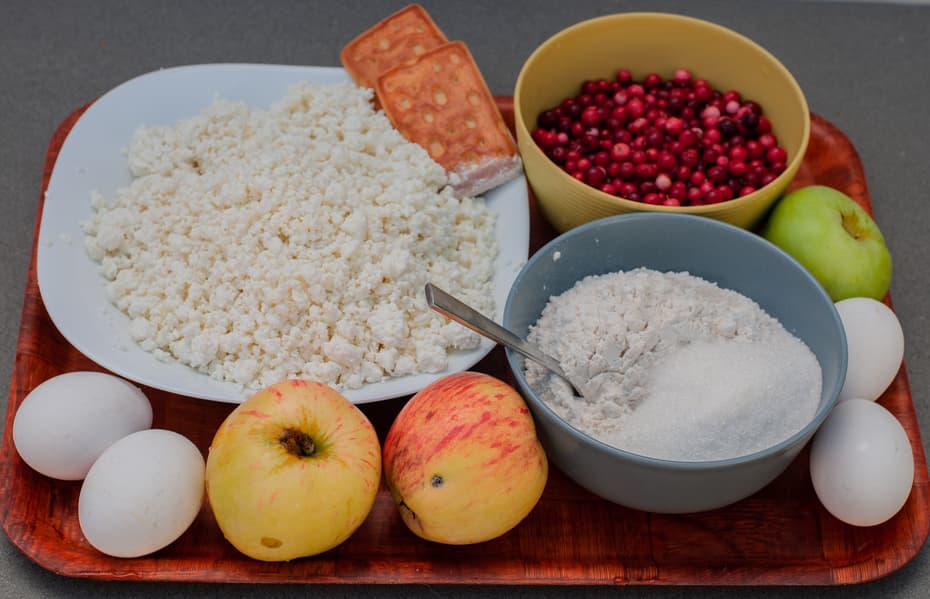 Мы взяли рассыпчатый творог, яйца, сахар, немного муки, бруснику и три больших яблока.