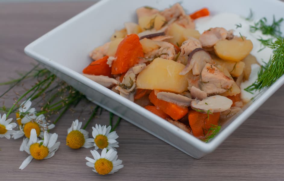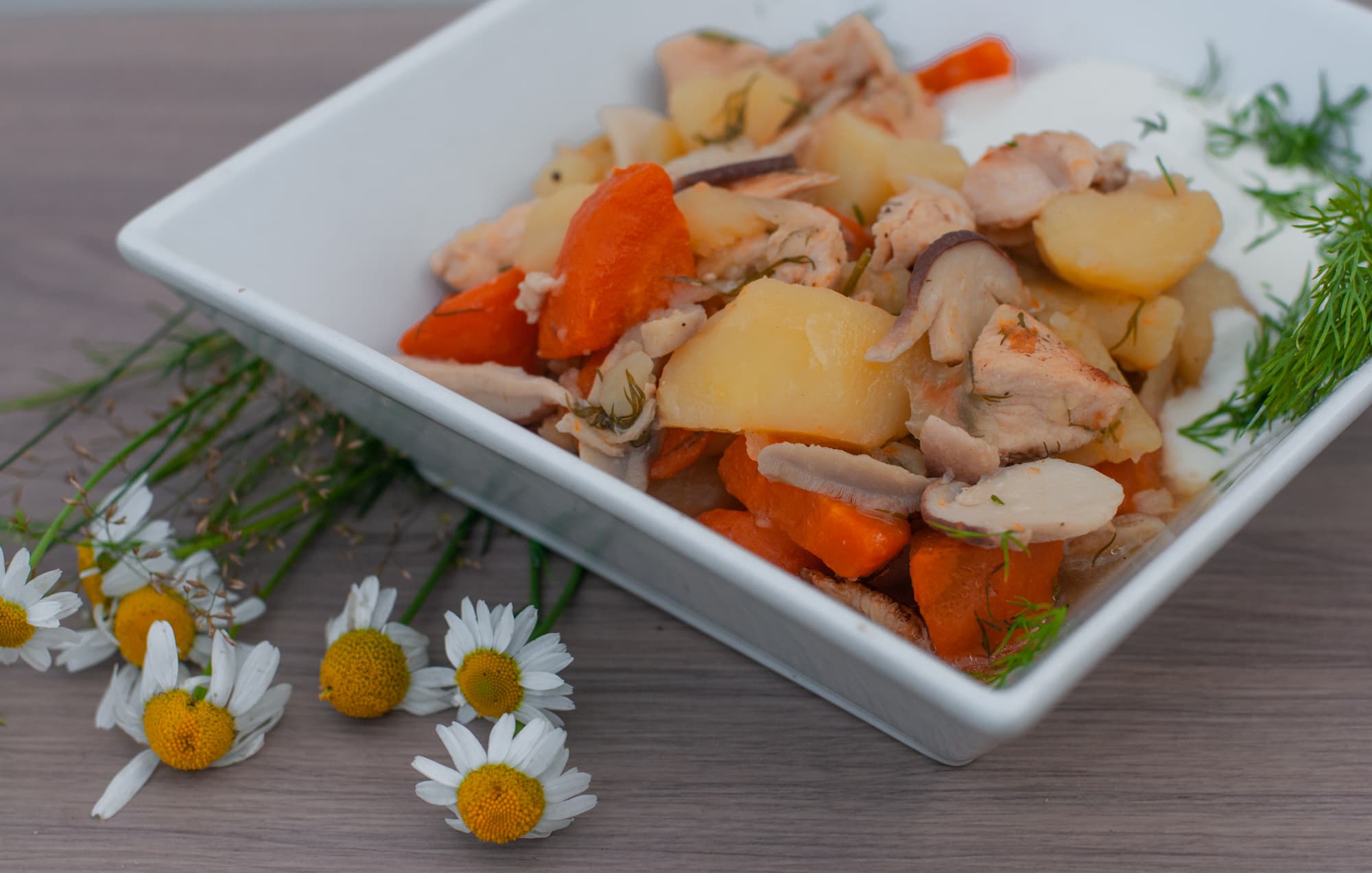 Нарезали, уложили курицу, лук, чеснок вниз, затем овощи и соль со специями, добавили воды. Поставили на программу «тушение». За 15 минут до окончания перемешали и добавили нарезанные грибы. После окончания программы подержали в режиме «подогрев» еще полчаса и разложили по тарелкам. Подали со сметаной и зеленью.