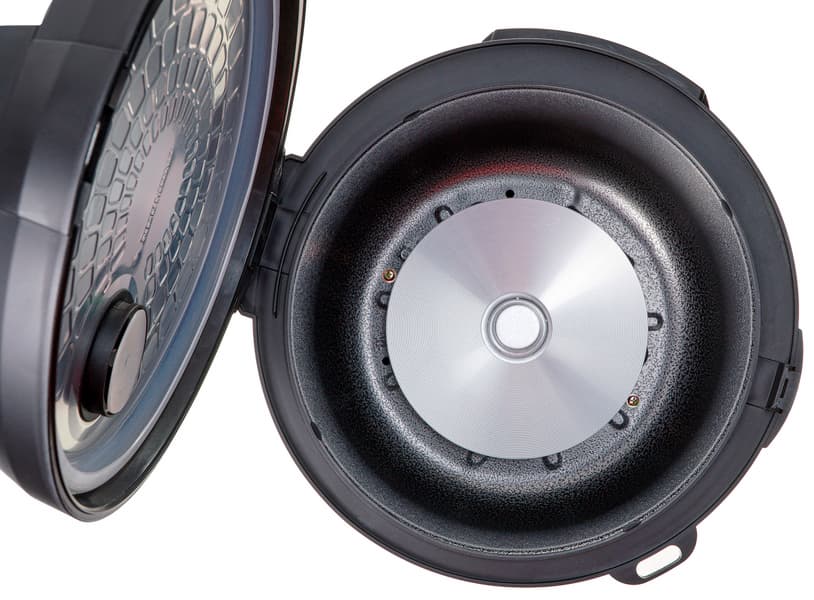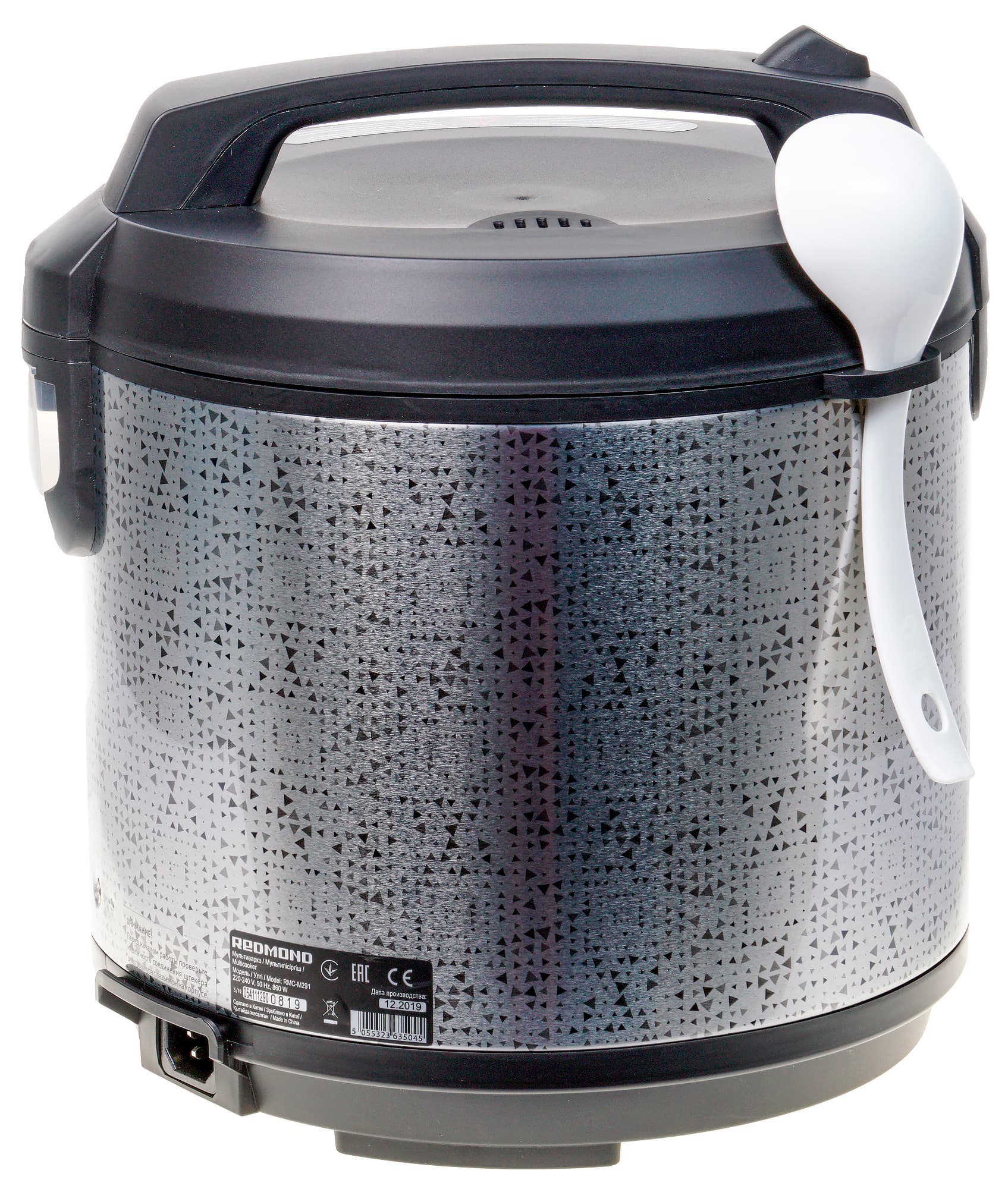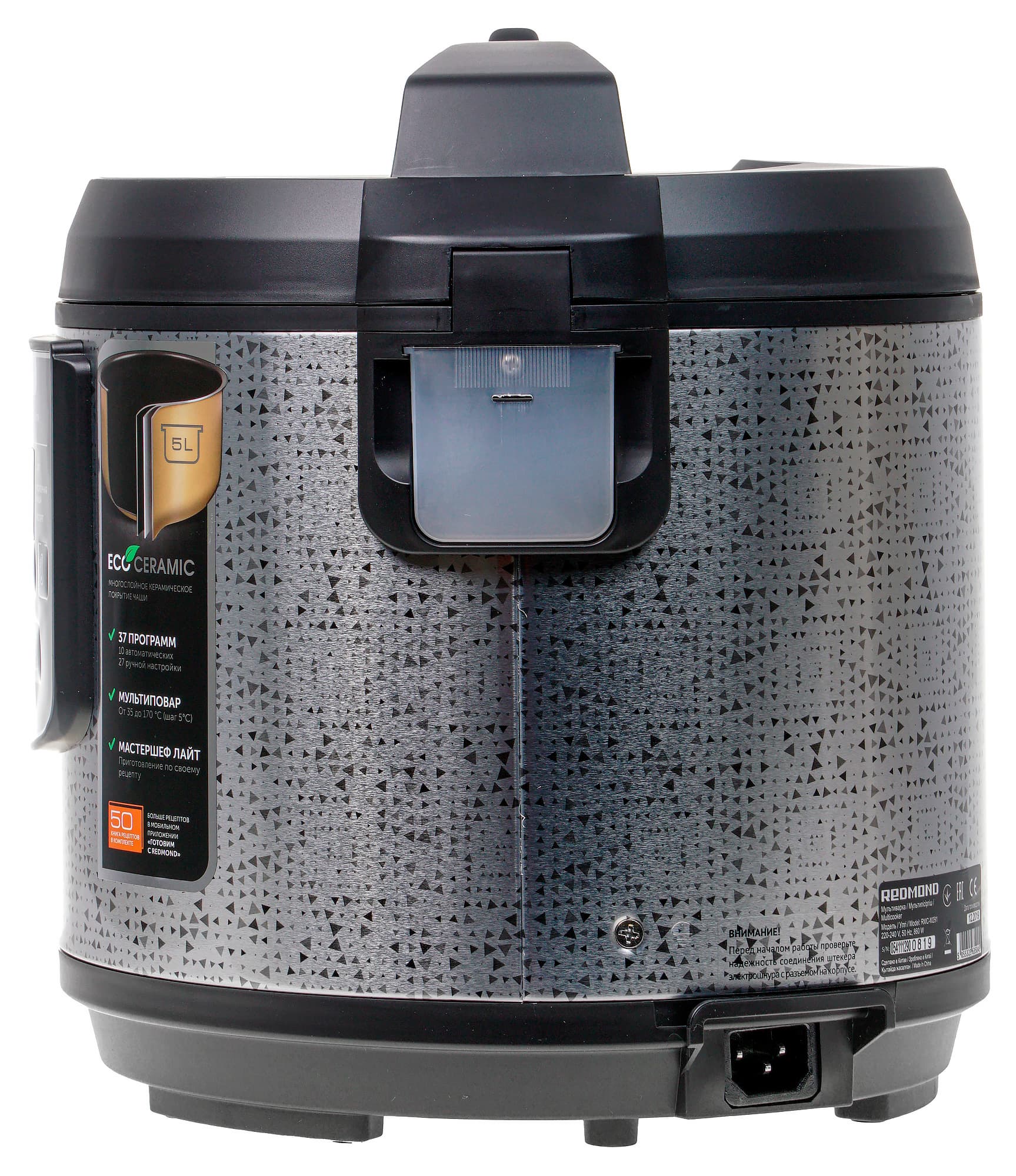 RMC-M291 имеет простую форму цилиндра с ручкой сверху. Основной цвет — серый с неброским геометрическим рисунком, на котором будет теряться мелкие загрязнения и разводы. Крышка мультиварки — пластиковая черная, без сложных дополнительных элементов.