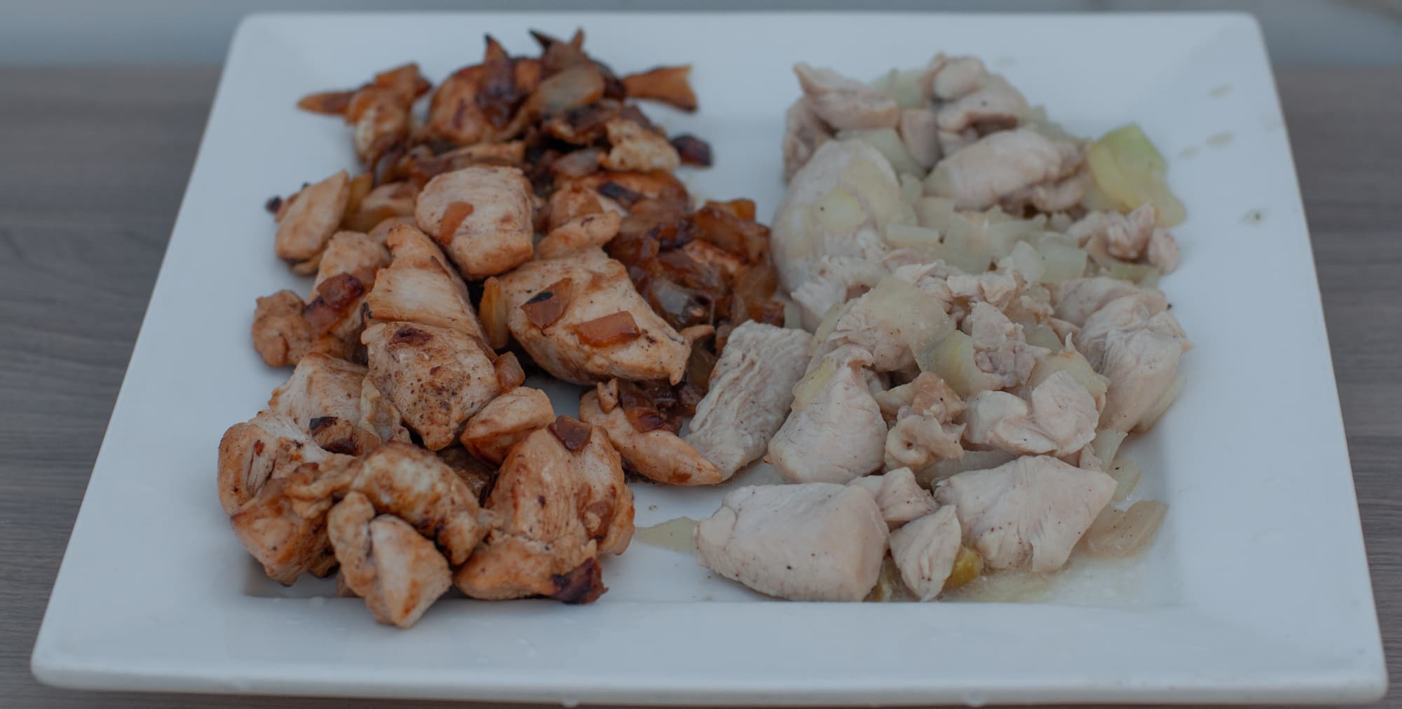 Мы решили протестировать программу «жарка» сделав в мультиварке жареную куриную грудку с луком. Для этого мы нарезали половину куриной грудки небольшими кусочками и одну луковицу кубиками. Вторую половину курицы и луковицу мы пожарили на сковородке для сравнения. Разогрели мультиварку на программе «жарка», налили растительного масла, положили курицу и лук. Жарили, изредка помешивая, около 15-20 минут. Курица не жарилась, а скорее тушилась из-за большого количества выделившейся жидкости и маленькой мощности мультиварки.
