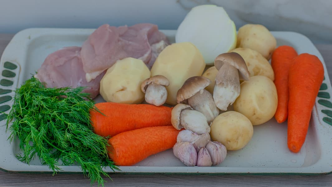 Чтобы протестировать программу тушения, мы решили сделать рагу из курицы и овощей с белыми грибами. Для этого мы взяли куриную грудку, картошку, морковь, лук, грибы, чеснок и зелень.