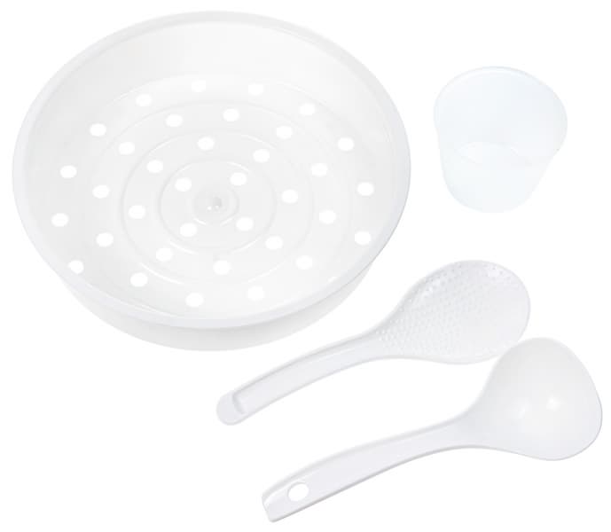 В комплекте вместе с прибором поставляется контейнер для приготовления на пару́, плоская ложка, черпак и мерный стакан. Все предметы пластиковые.