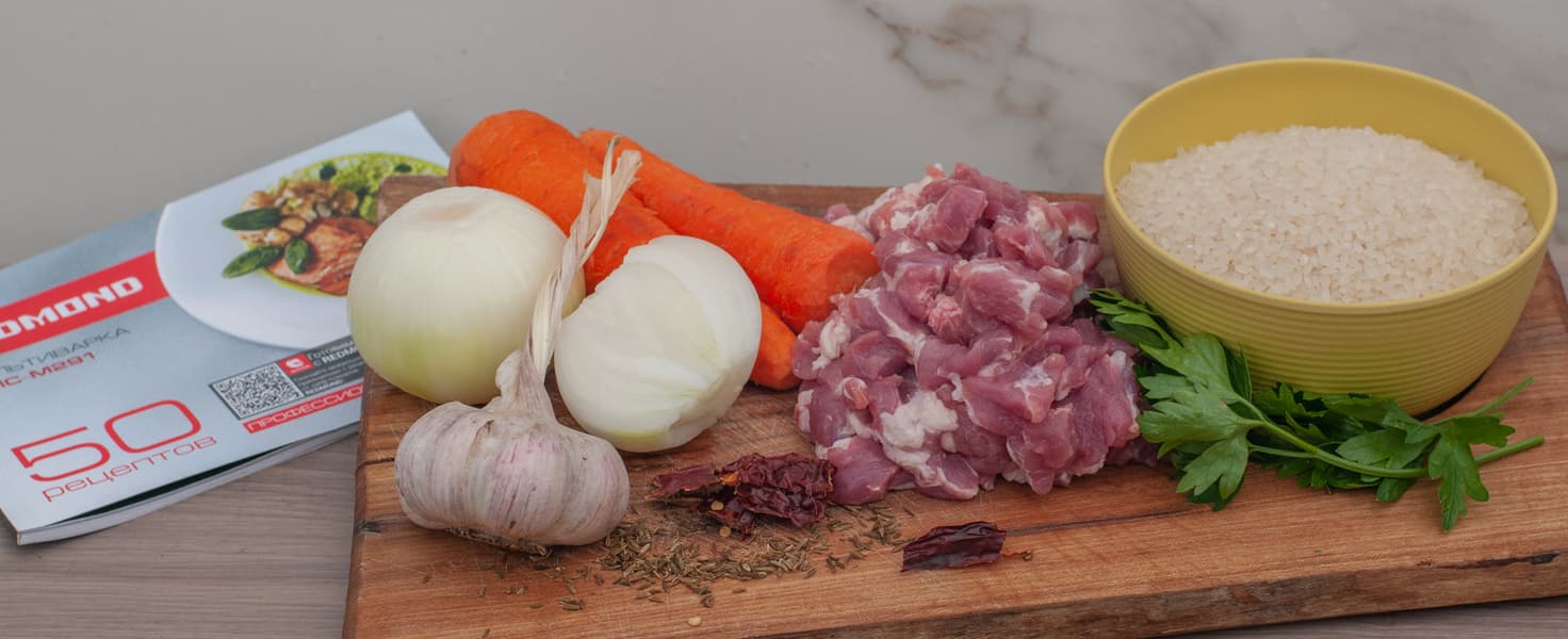 Мы решили сделать плов строго соответствуя рецепту из книги Redmond «50 рецептов», приложенной к мультиварке. Для плова мы взяли указанное количество риса, свиной шеи, моркови, лука, чеснока, растительного масла, воды, соли и специй.
